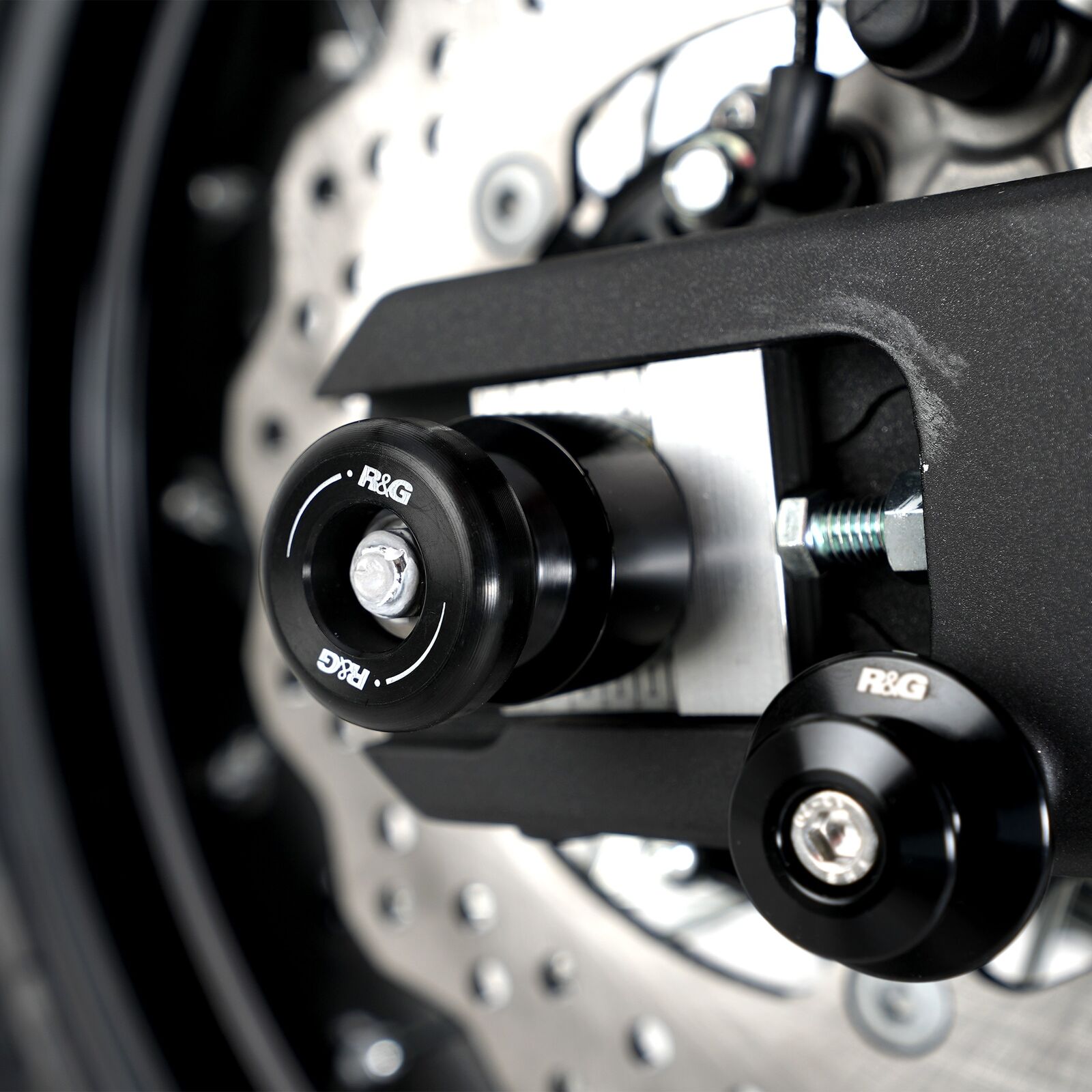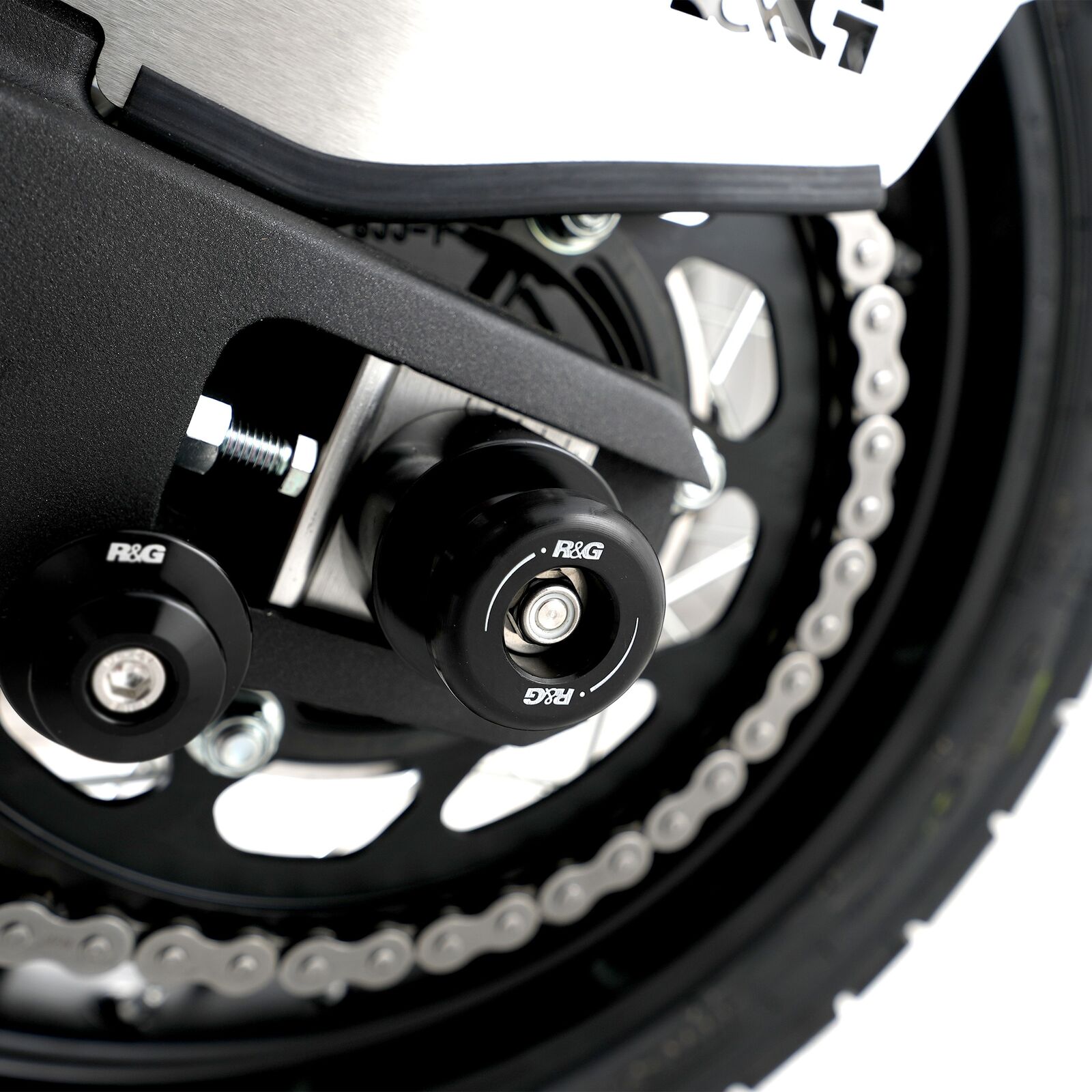 The R&G swingarm protectors provide protection for vulnerable rear end components in the event of a crash, drop or slide. Replaceable High-Density Polyethylene (HDPE) bobbins are used for superior impact and abrasion protection that helps slow the motorcycle to a smooth, controlled stop. This essential protector will keep valuable components off the ground to prevent some seriously expensive repairs after a fall. Installation is simple with no permanent modification to the bike needed.