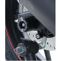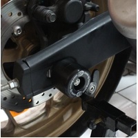 These swingarm protectors, for the Yamaha R25 '14-, MT-25 '15- & R3 '15- models fit into the rear spindle and provide added protection to the swingarm area and swingarm components. Easy to install, the sliders are held in place thanks to there connecting threaded spindle bar, connecting one side to the other ensuring the kit is secure in place. They help keep those core components found in/on the swingarm area such as the rear brake caliper, disc, Rear sprocket and swingarm lifted up off the ground, out of harms way in the event of a crash. Please note: Paddock stand bobbins / Paddock stand (as seen in pictures) are NOT included but are available seperately!