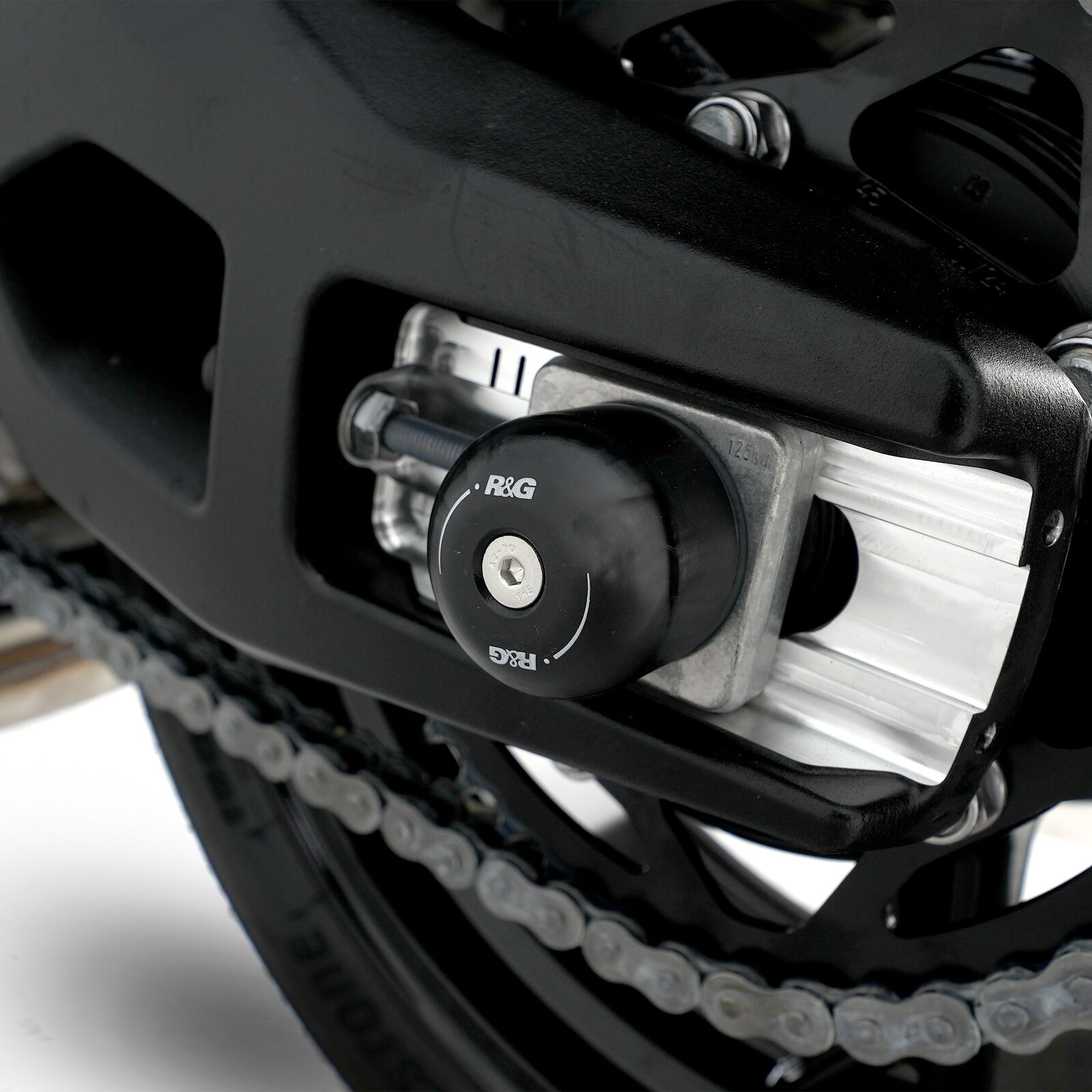 These swingarm protectors are suitable for the BMW F800GS '24-/ S1000RR '18-, BMW F750GS/F850GS '18- '24/ F850GSA 19- F900GS '24-, BMW S1000RX, BMW HP4, F900 R '20- & S1000R '14-/ Sport/  M Sport '21- '24 & M1000RR '21- '24 & M1000R '23- '24/M1000XR '24-, Suzuki GSXR 600 K6-, 750 '06- '24, 1000 K5-, Yamaha MT-10 '16- & SP '17- and Suzuki DL1000 V-Strom '14- & Yamaha Niken '18- (with the larger internal spindle diameters of 16mm and 24mm). They fit to the rear spindle and provide added protection to the swingarm area. Easy to install thanks to there expanding design, they help keep those core components found in the swingarm area such as the rear brake caliper, disc, Rear sprocket and swingarm lifted up off the ground and out of harms way in the event of a crash.