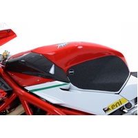 R&G Tank Traction Grip kits are available for many different bike styles and brands, with new applications released regularly. The unique R&G Traction Grip texture was specifically designed to be both soft and durable, providing the rider with the grip and feel he/she needs to assist in better bike control, enabling the rider to maintain a stable body position while cornering and braking, whilst also relieving fatigue and providing the rider with complete confidence allowing him/her to fully focus on the road (or track) ahead instead of slipping and sliding on the tank. Each Tank Traction Grip kit is supplied with precision pre-cut adhesive pieces, designed to fit the intended bike, typically in either 2, 4 or 6 pieces (in total) depending on the shape of the tank and adjoining fairing. The high-strength adhesive backing ensures a highly durable product that will stay exactly where you put it, as well as not affecting or damaging paintwork. Each R&G Tank Traction Grip kit is available in black and ultra-clear finishes to blend into your bike’s paintwork or stand out, depending on your preference. R&G Tank Traction Grips work in both wet and dry conditions and is equally at home on the track as it is on the commute home! Please note: R&G Tank Traction Grips now come with a 25mm diameter stick on emblem. This Tank Traction Grip kit has been specially designed for the MV Agusta F4 750/ 1000R '10- / F4RR/ F4RC. Made in the UK.