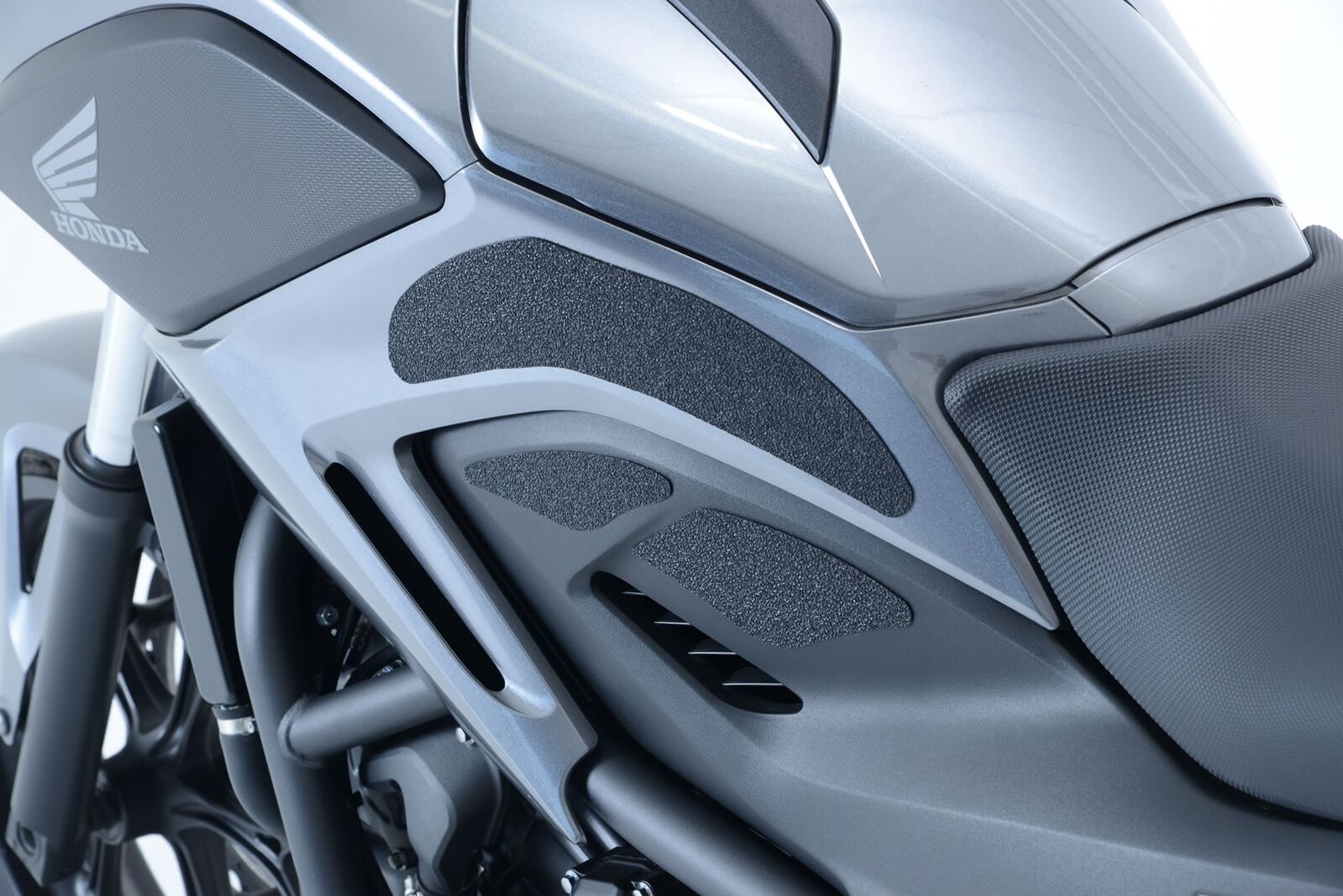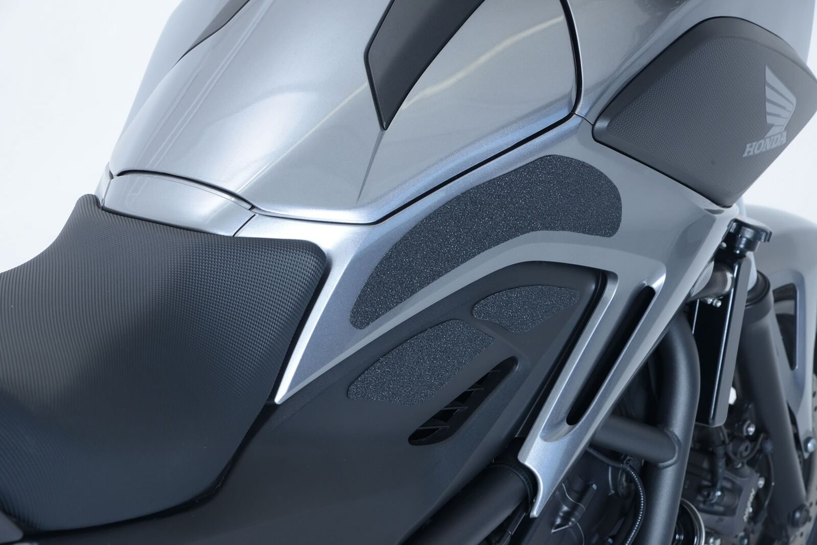 R&G Tank Traction Grip kits are available for many different bike styles and brands, with new applications released regularly. The unique R&G Traction Grip texture was specifically designed to be both soft and durable, providing the rider with the grip and feel he/she needs to assist in better bike control, enabling the rider to maintain a stable body position while cornering and braking, whilst also relieving fatigue and providing the rider with complete confidence allowing him/her to fully focus on the road (or track) ahead instead of slipping and sliding on the tank. Each Tank Traction Grip kit is supplied with precision pre-cut adhesive pieces, designed to fit the intended bike, typically in either 2, 4 or 6 pieces (in total) depending on the shape of the tank and adjoining fairing. The high-strength adhesive backing ensures a highly durable product that will stay exactly where you put it, as well as not affecting or damaging paintwork. Each R&G Tank Traction Grip kit is available in black and ultra-clear finishes to blend into your bike’s paintwork or stand out, depending on your preference. R&G Traction Pads work in both wet and dry conditions and is equally at home on the track as it is on the commute home! Please note: R&G Tank Traction Grips now come with a 25mm diameter stick on emblem. This Tank Traction Grip Kit has been specially designed for the Honda NC700X '12-'15 / NC750X '13-'15. Made in the UK.