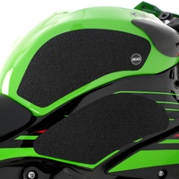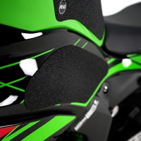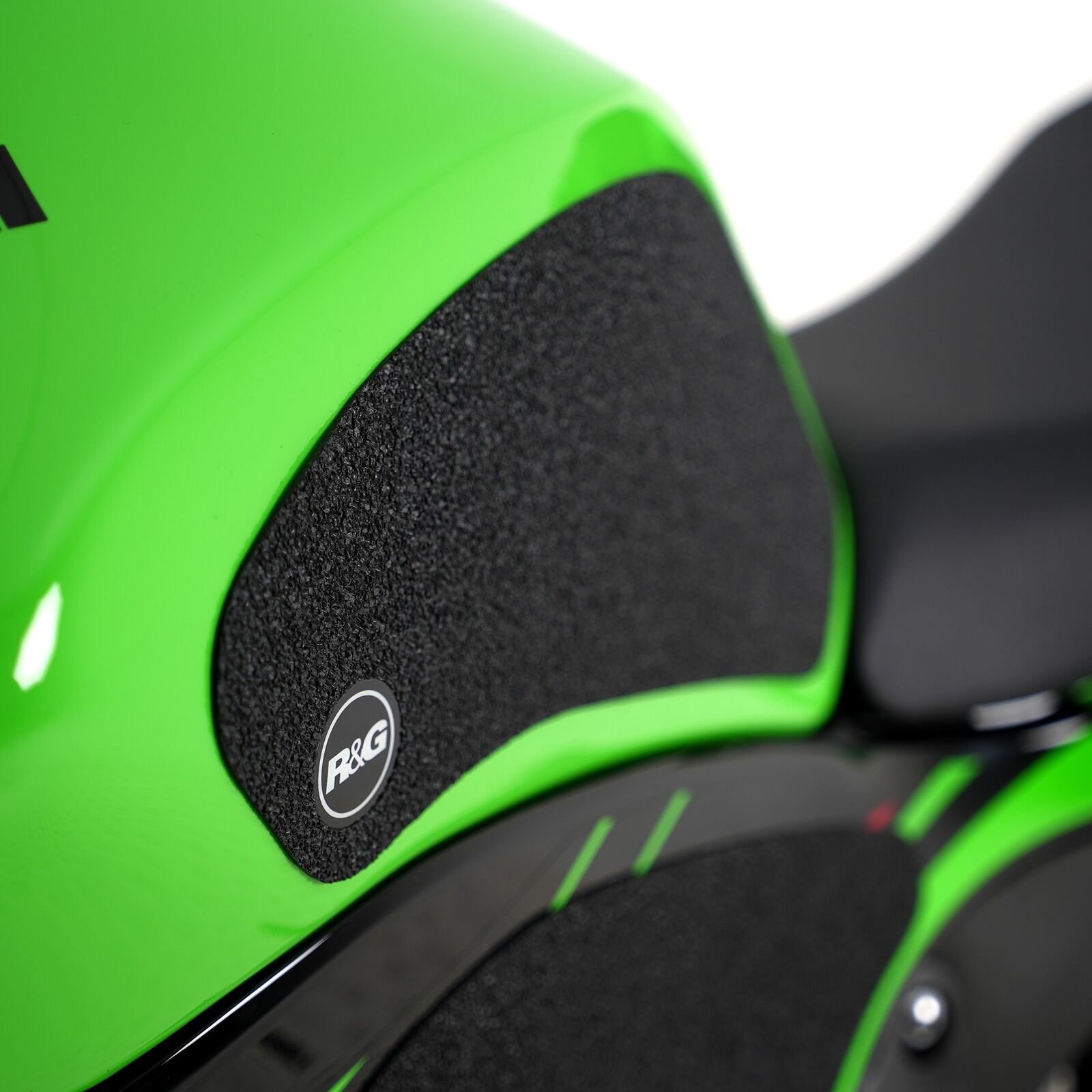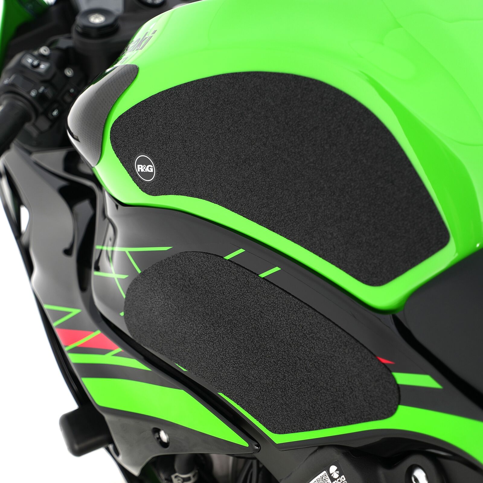 R&G Tank Traction Grip kits are available for many different bike styles and brands, with new applications released regularly. The unique R&G Traction Grip texture was specifically designed to be both soft and durable, providing the rider with the grip and feel he/she needs to assist in better bike control, enabling the rider to maintain a stable body position while cornering and braking, whilst also relieving fatigue and providing the rider with complete confidence allowing him/her to fully focus on the road (or track) ahead instead of slipping and sliding on the tank. Each Tank Traction Grip kit is supplied with precision pre-cut adhesive pieces, designed to fit the intended bike, typically in either 2, 4 or 6 pieces (in total) depending on the shape of the tank and adjoining fairing. The high-strength adhesive backing ensures a highly durable product that will stay exactly where you put it, as well as not affecting or damaging paintwork. Each R&G Tank Traction Grip kit is available in black and ultra-clear finishes to blend into your bike’s paintwork or stand out, depending on your preference. R&G Traction Grips work in both wet and dry conditions and is equally at home on the track as it is on the commute home! Please note: R&G Tank Traction Grips now come with a 25mm diameter stick on emblem. This Tank Traction Grip has been specially designed for the Kawasaki ZX-6R 636 '13- '24. Made in the UK.