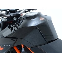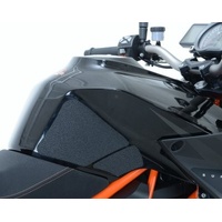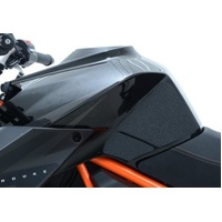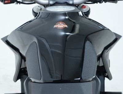 R&G Tank Traction Grip kits are available for many different bike styles and brands, with new applications released regularly. The unique R&G Traction Grip texture was specifically designed to be both soft and durable, providing the rider with the grip and feel he/she needs to assist in better bike control, enabling the rider to maintain a stable body position while cornering and braking, whilst also relieving fatigue and providing the rider with complete confidence allowing him/her to fully focus on the road (or track) ahead instead of slipping and sliding on the tank. Each Tank Traction Grip kit is supplied with precision pre-cut adhesive pieces, designed to fit the intended bike, typically in either 2, 4 or 6 pieces (in total) depending on the shape of the tank and adjoining fairing. The high-strength adhesive backing ensures a highly durable product that will stay exactly where you put it, as well as not affecting or damaging paintwork. Each R&G Tank Traction Grip kit is available in black and ultra-clear finishes to blend into your bike’s paintwork or stand out, depending on your preference. R&G Tank Traction Grips works in both wet and dry conditions and is equally at home on the track as it is on the commute home! Please note: R&G Tank Traction Grips now come with a 25mm diameter stick on emblem. This Tank Traction Grip kit has been specially designed for the KTM 1290 SUPERDUKE R '14 - '19. Made in the UK.