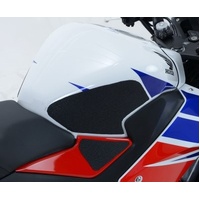 R&G Tank Traction Grip kits are available for many different bike styles and brands, with new applications released regularly. The unique R&G Traction Grip texture was specifically designed to be both soft and durable, providing the rider with the grip and feel he/she needs to assist in better bike control, enabling the rider to maintain a stable body position while cornering and braking, whilst also relieving fatigue and providing the rider with complete confidence allowing him/her to fully focus on the road (or track) ahead instead of slipping and sliding on the tank. Each Tank Traction Grip kit is supplied with precision pre-cut adhesive pieces, designed to fit the intended bike, typically in either 2, 4 or 6 pieces (in total) depending on the shape of the tank and adjoining fairing. The high-strength adhesive backing ensures a highly durable product that will stay exactly where you put it, as well as not affecting or damaging paintwork. Each R&G Tank Traction Grip kit is available in black and ultra-clear finishes to blend into your bike’s paintwork or stand out, depending on your preference. R&G Traction Grips works in both wet and dry conditions and is equally at home on the track as it is on the commute home! Please note: R&G Tank Traction Grips now come with a 25mm diameter stick on emblem. These R&G Tank Traction Grips have been specially designed for the Honda CBR300R '14-. Made in the UK.