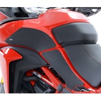 R&G Tank Traction Grip kits are available for many different bike styles and brands, with new applications released regularly. The unique R&G Tank Traction Grip texture was specifically designed to be both soft and durable, providing the rider with the grip and feel he/she needs to assist in better bike control, enabling the rider to maintain a stable body position while cornering and braking, whilst also relieving fatigue and providing the rider with complete confidence allowing him/her to fully focus on the road (or track) ahead instead of slipping and sliding on the tank. Each Tank Traction Grip kit is supplied with precision pre-cut adhesive pieces, designed to fit the intended bike, typically in either 2, 4 or 6 pieces (in total) depending on the shape of the tank and adjoining fairing. The high-strength adhesive backing ensures a highly durable product that will stay exactly where you put it, as well as not affecting or damaging paintwork. Each R&G Tank Traction Grip kit is available in black and ultra-clear finishes to blend into your bike’s paintwork or stand out, depending on your preference. R&G Tank Traction Grips work in both wet and dry conditions and is equally at home on the track as it is on the commute home! Please note: R&G Tank Traction Grips now come with a 25mm diameter stick on emblem. This 4 piece R&G Tank Traction Grip kit has been specially designed for the Ducati Multistrada 1200 '15- models. Made in the UK.