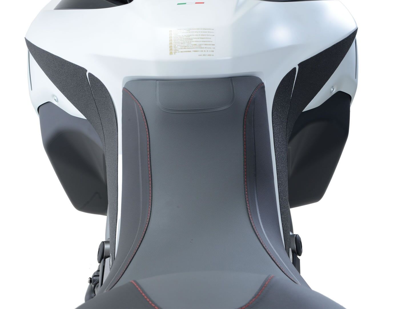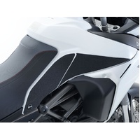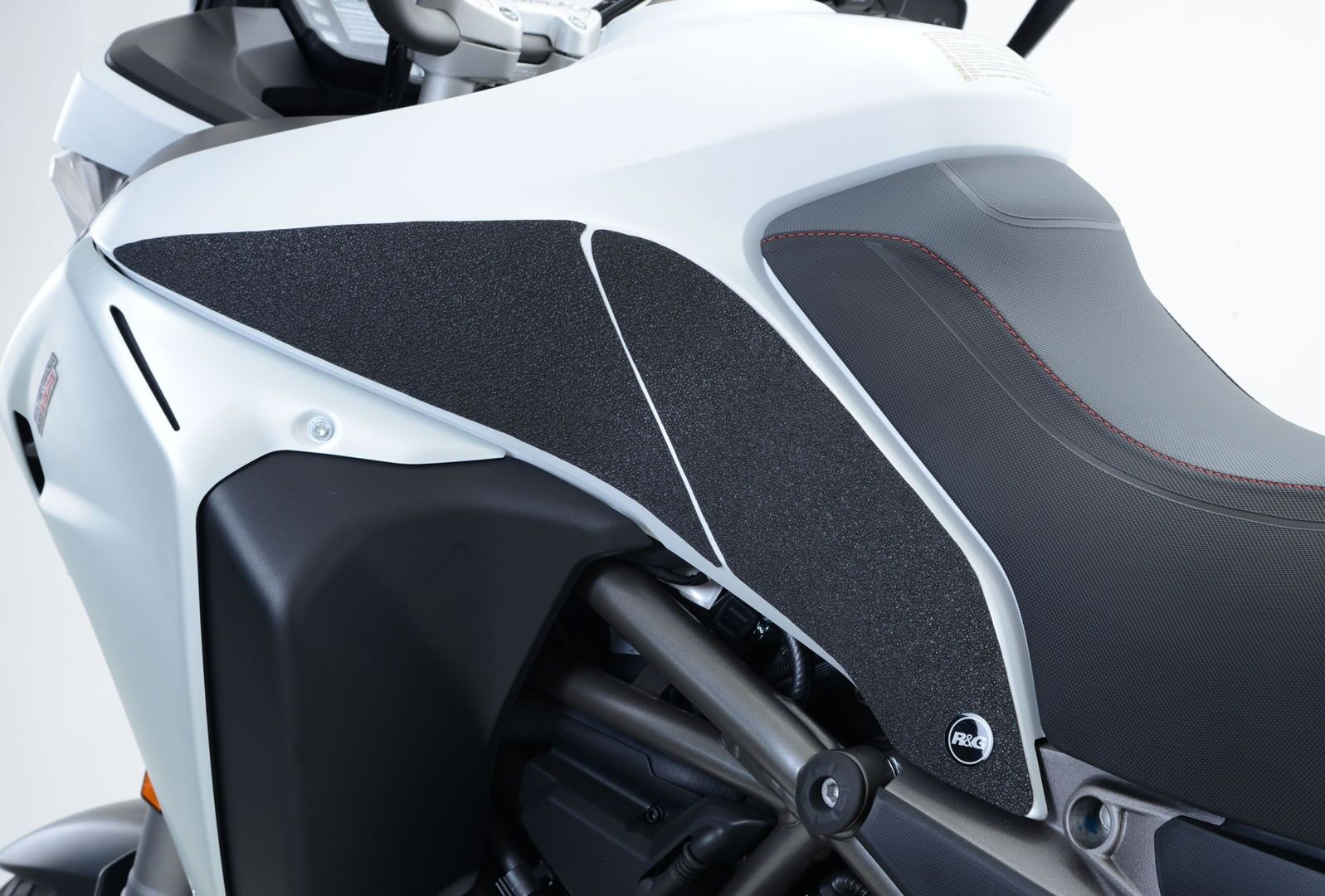 R&G Tank Traction Grip kits are available for many different bike styles and brands, with new applications released regularly. The unique R&G Tank Traction Grip texture was specifically designed to be both soft and durable, providing the rider with the grip and feel he/she needs to assist in better bike control, enabling the rider to maintain a stable body position while cornering and braking, whilst also relieving fatigue and providing the rider with complete confidence allowing him/her to fully focus on the road (or track) ahead instead of slipping and sliding on the tank. Each Tank Traction Grip kit is supplied with precision pre-cut adhesive pieces, designed to fit the intended bike, typically in either 2, 4 or 6 pieces (in total) depending on the shape of the tank and adjoining fairing. The high-strength adhesive backing ensures a highly durable product that will stay exactly where you put it, as well as not affecting or damaging paintwork. Each R&G Tank Traction Grip kit is available in black and ultra-clear finishes to blend into your bike’s paintwork or stand out, depending on your preference. R&G Tank Traction Grips work in both wet and dry conditions and is equally at home on the track as it is on the commute home! Please note: R&G Tank Traction Grips now come with a 25mm diameter stick on emblem. This 4 piece R&G Tank Traction Grip kit has been specially designed for the Ducati Multistrada 1200 ENDURO '16- models. Made in the UK.