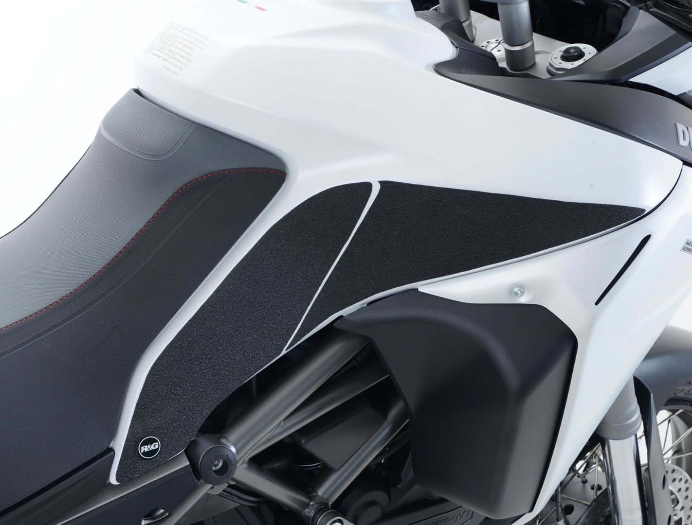 R&G Tank Traction Grip kits are available for many different bike styles and brands, with new applications released regularly. The unique R&G Tank Traction Grip texture was specifically designed to be both soft and durable, providing the rider with the grip and feel he/she needs to assist in better bike control, enabling the rider to maintain a stable body position while cornering and braking, whilst also relieving fatigue and providing the rider with complete confidence allowing him/her to fully focus on the road (or track) ahead instead of slipping and sliding on the tank. Each Tank Traction Grip kit is supplied with precision pre-cut adhesive pieces, designed to fit the intended bike, typically in either 2, 4 or 6 pieces (in total) depending on the shape of the tank and adjoining fairing. The high-strength adhesive backing ensures a highly durable product that will stay exactly where you put it, as well as not affecting or damaging paintwork. Each R&G Tank Traction Grip kit is available in black and ultra-clear finishes to blend into your bike’s paintwork or stand out, depending on your preference. R&G Tank Traction Grips work in both wet and dry conditions and is equally at home on the track as it is on the commute home! Please note: R&G Tank Traction Grips now come with a 25mm diameter stick on emblem. This 4 piece R&G Tank Traction Grip kit has been specially designed for the Ducati Multistrada 1200 ENDURO '16- models. Made in the UK.
