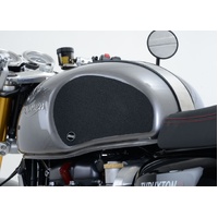 R&G Tank Traction Grip kits are available for many different bike styles and brands, with new applications released regularly. The unique R&G texture was specifically designed to be both soft and durable, providing the rider with the grip and feel he/she needs to assist in better bike control, enabling the rider to maintain a stable body position while cornering and braking, whilst also relieving fatigue and providing the rider with complete confidence allowing him/her to fully focus on the road (or track) ahead instead of slipping and sliding on the tank. Each Tank Traction Grip kit is supplied with precision pre-cut adhesive pieces, designed to fit the intended bike, typically in either 2, 4 or 6 pieces (in total) depending on the shape of the tank and adjoining fairing. The high-strength adhesive backing ensures a highly durable product that will stay exactly where you put it, as well as not affecting or damaging paintwork. Each R&G Tank Traction Grip kit is available in black and ultra-clear finishes to blend into your bike’s paintwork or stand out, depending on your preference. R&G Tank Traction Grips work in both wet and dry conditions and is equally at home on the track as it is on the commute home! Please note: R&G Tank Traction Grips now come with a 25mm diameter stick on emblem. This R&G Tank Traction Grip kit have been specially designed for the Triumph Thruxton 1200 and 1200R '16-. Made in the UK.