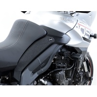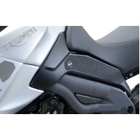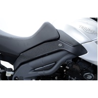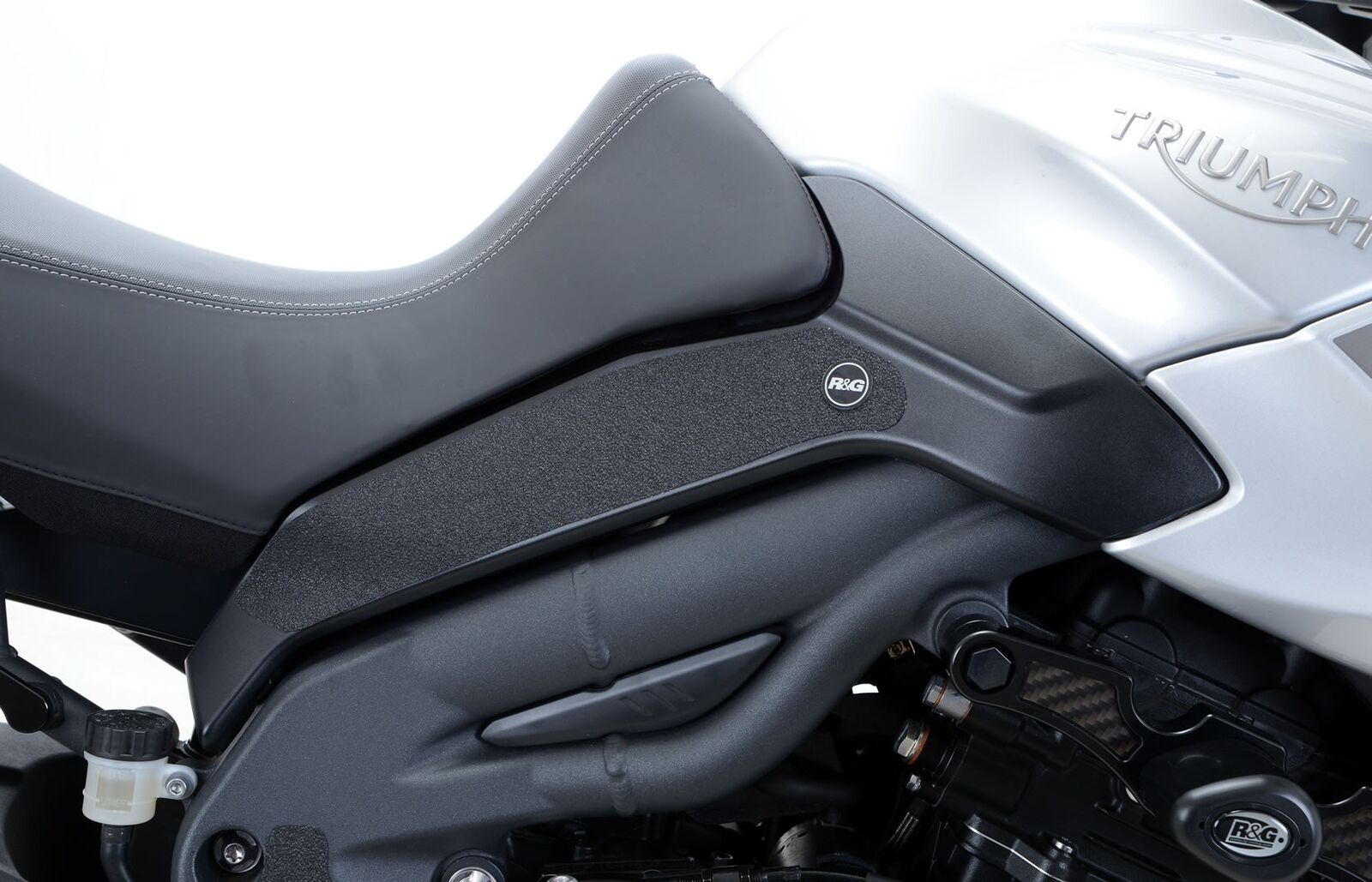 R&G Tank Traction Grip kits are available for many different bike styles and brands, with new applications released regularly. The unique R&G texture was specifically designed to be both soft and durable, providing the rider with the grip and feel he/she needs to assist in better bike control, enabling the rider to maintain a stable body position while cornering and braking, whilst also relieving fatigue and providing the rider with complete confidence allowing him/her to fully focus on the road (or track) ahead instead of slipping and sliding on the tank. Each Tank Traction Grip kit is supplied with precision pre-cut adhesive pieces, designed to fit the intended bike, typically in either 2, 4 or 6 pieces (in total) depending on the shape of the tank and adjoining fairing. The high-strength adhesive backing ensures a highly durable product that will stay exactly where you put it, as well as not affecting or damaging paintwork. Each R&G Tank Traction Grip kit is available in black and ultra-clear finishes to blend into your bike’s paintwork or stand out, depending on your preference. R&G Tank Traction Grips work in both wet and dry conditions and is equally at home on the track as it is on the commute home! Please note: R&G Tank Traction Grips now come with a 25mm diameter stick on emblem. This 2 piece R&G Tank Traction Grips have been specially designed for the Triumph Tiger Sport 1050 '16- models. Made in the UK.