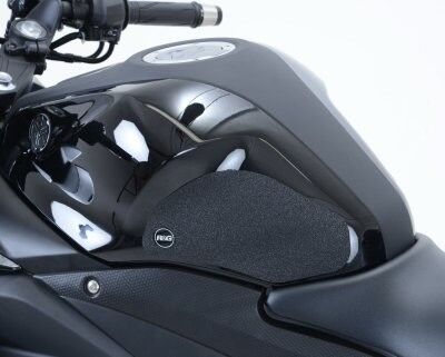 R&G Tank Traction Grip kits are available for many different bike styles and brands, with new applications released regularly. The unique R&G Traction Grip texture was specifically designed to be both soft and durable, providing the rider with the grip and feel he/she needs to assist in better bike control, enabling the rider to maintain a stable body position while cornering and braking, whilst also relieving fatigue and providing the rider with complete confidence allowing him/her to fully focus on the road (or track) ahead instead of slipping and sliding on the tank. Each Tank Traction Grip kit is supplied with precision pre-cut adhesive pieces, designed to fit the intended bike, typically in either 2, 4 or 6 pieces (in total) depending on the shape of the tank and adjoining fairing. The high-strength adhesive backing ensures a highly durable product that will stay exactly where you put it, as well as not affecting or damaging the paintwork. Each R&G Tank Traction Grip kit is available in black and ultra-clear finishes to blend into your bike’s paintwork or stand out, depending on your preference. R&G Tank Traction Grips work in both wet and dry conditions and is equally at home on the track as it is on the commute home! Please note: R&G Tank Traction Grips now come with a 25mm diameter stick on emblem. This Tank Traction Grip kit has been specially designed for the Yamaha R25 '14-'18, MT-25 '15-, R3 '15-'18 & MT-03 '16-'19 models. Made in the UK.