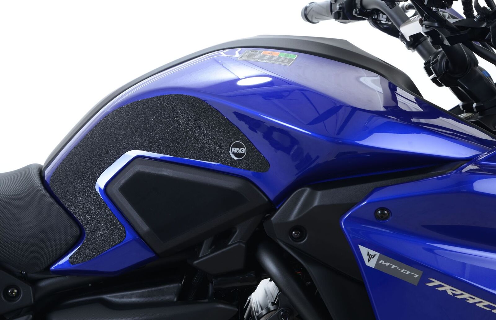 R&G Tank Traction Grip kits are available for many different bike styles and brands, with new applications released regularly. The unique R&G Tank Traction Grip texture was specifically designed to be both soft and durable, providing the rider with the grip and feel he/she needs to assist in better bike control, enabling the rider to maintain a stable body position while cornering and braking, whilst also relieving fatigue and providing the rider with complete confidence allowing him/her to fully focus on the road (or track) ahead instead of slipping and sliding on the tank. Each Tank Traction Grip kit is supplied with precision pre-cut adhesive pieces, designed to fit the intended bike, typically in either 2, 4 or 6 pieces (in total) depending on the shape of the tank and adjoining fairing. The high-strength adhesive backing ensures a highly durable product that will stay exactly where you put it, as well as not affecting or damaging paintwork. Each R&G Tank Traction Grip kit is available in black and ultra-clear finishes to blend into your bike’s paintwork or stand out, depending on your preference. R&G works in both wet and dry conditions and is equally at home on the track as it is on the commute home! Please note: R&G Tank Traction Grips now come with a 25mm diameter stick on emblem. This 2-piece Tank Traction Grip kit has been specially designed for the Yamaha Tracer 700 (MT-07 Tracer) (FJ-07) '16-'20 models. Made in the UK.