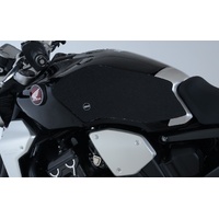 R&G Tank Traction Grip kits are available for many different bike styles and brands, with new applications released regularly. The unique R&G Traction Grip texture was specifically designed to be both soft and durable, providing the rider with the grip and feel he/she needs to assist in better bike control, enabling the rider to maintain a stable body position while cornering and braking, whilst also relieving fatigue and providing the rider with complete confidence allowing him/her to fully focus on the road (or track) ahead instead of slipping and sliding on the tank. Each Tank Traction Grip kit is supplied with precision pre-cut adhesive pieces, designed to fit the intended bike, typically in either 2, 4 or 6 pieces (in total) depending on the shape of the tank and adjoining fairing. The high-strength adhesive backing ensures a highly durable product that will stay exactly where you put it, as well as not affecting or damaging paintwork. Each R&G Tank Traction Grip kit is available in black and ultra-clear finishes to blend into your bike’s paintwork or stand out, depending on your preference. R&G Tank Traction Grips work in both wet and dry conditions and is equally at home on the track as it is on the commute home! Please note: R&G Tank Traction Grips now come with a 25mm diameter stick on emblem. This 2 piece R&G Tank Traction Grip kit has been specially designed for the Honda CB1000R(+) '18- model.. Made in the UK.