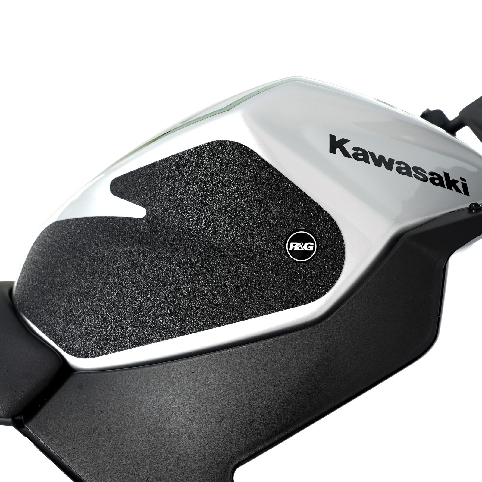 R&G Tank Traction Grip kits are available for many different bike styles and brands, with new applications released regularly. The unique R&G Traction Grip texture was specifically designed to be both soft and durable, providing the rider with the grip and feel he/she needs to assist in better bike control, enabling the rider to maintain a stable body position while cornering and braking, whilst also relieving fatigue and providing the rider with complete confidence allowing him/her to fully focus on the road (or track) ahead instead of slipping and sliding on the tank. Each Tank Traction Grip kit is supplied with precision pre-cut adhesive pieces, designed to fit the intended bike, typically in either 2, 4 or 6 pieces (in total) depending on the shape of the tank and adjoining fairing. The high-strength adhesive backing ensures a highly durable product that will stay exactly where you put it, as well as not affecting or damaging paintwork. Each R&G Tank Traction Grip kit is available in black and ultra-clear finishes to blend into your bike’s paintwork or stand out, depending on your preference. R&G Tank Traction Grips work in both wet and dry conditions and is equally at home on the track as it is on the commute home! Please note: R&G Tank Traction Grips now come with a 25mm diameter stick on emblem. This 2 piece R&G Tank Traction Grip kit has been specially designed for the Kawasaki  Ninja 7 Hybrid HEV / Z 7 Hybrid HEV '24-, Ninja 250/400 '18- & Z400/ Z250 '19-, Z500 (Ninja) '24- model. Made in the UK.