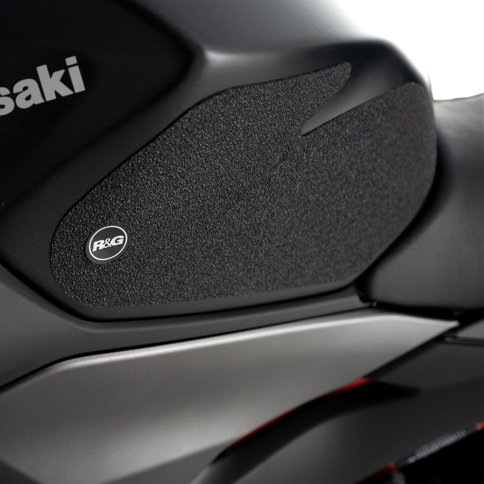R&G Tank Traction Grip kits are available for many different bike styles and brands, with new applications released regularly. The unique R&G Traction Grip texture was specifically designed to be both soft and durable, providing the rider with the grip and feel he/she needs to assist in better bike control, enabling the rider to maintain a stable body position while cornering and braking, whilst also relieving fatigue and providing the rider with complete confidence allowing him/her to fully focus on the road (or track) ahead instead of slipping and sliding on the tank. Each Tank Traction Grip kit is supplied with precision pre-cut adhesive pieces, designed to fit the intended bike, typically in either 2, 4 or 6 pieces (in total) depending on the shape of the tank and adjoining fairing. The high-strength adhesive backing ensures a highly durable product that will stay exactly where you put it, as well as not affecting or damaging paintwork. Each R&G Tank Traction Grip kit is available in black and ultra-clear finishes to blend into your bike’s paintwork or stand out, depending on your preference. R&G Tank Traction Grips work in both wet and dry conditions and is equally at home on the track as it is on the commute home! Please note: R&G Tank Traction Grips now come with a 25mm diameter stick on emblem. This 2 piece R&G Tank Traction Grip kit has been specially designed for the Kawasaki  Ninja 7 Hybrid HEV / Z 7 Hybrid HEV '24-, Ninja 250/400 '18- & Z400/ Z250 '19-, Z500 (Ninja) '24- model. Made in the UK.