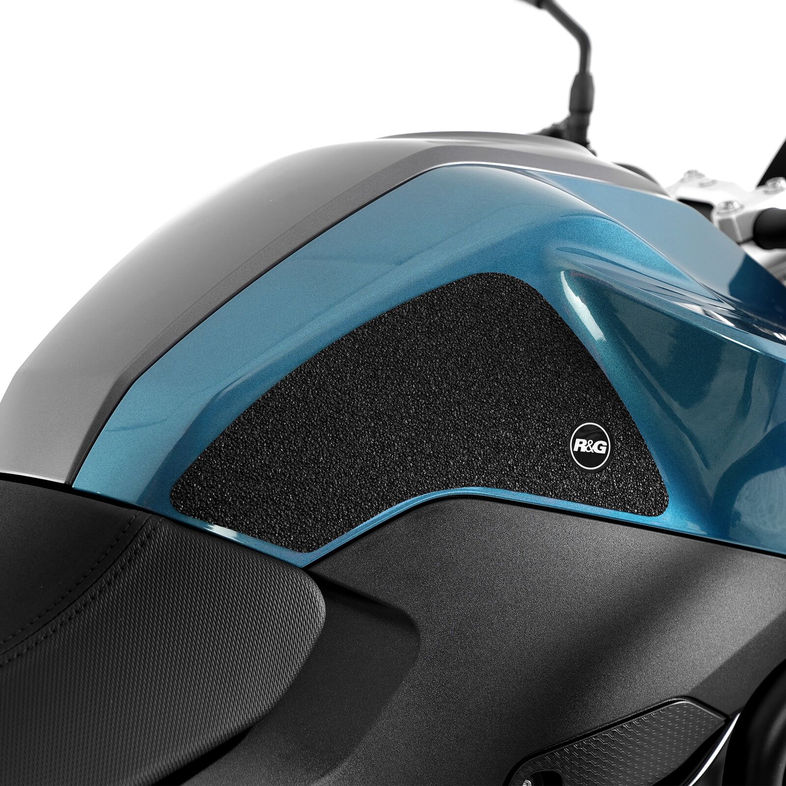 R&G Tank Traction Grip kits are available for many different bike styles and brands, with new applications released regularly. The unique R&G Traction Grip texture was specifically designed to be both soft and durable, providing the rider with the grip and feel he/she needs to assist in better bike control, enabling the rider to maintain a stable body position while cornering and braking, whilst also relieving fatigue and providing the rider with complete confidence allowing him/her to fully focus on the road (or track) ahead instead of slipping and sliding on the tank. Each Tank Traction Grip kit is supplied with precision pre-cut adhesive pieces, designed to fit the intended bike, typically in either 2, 4 or 6 pieces (in total) depending on the shape of the tank and adjoining fairing. The high-strength adhesive backing ensures a highly durable product that will stay exactly where you put it, as well as not affecting or damaging paintwork. Each R&G Tank Traction Grip kit is available in black and ultra-clear finishes to blend into your bike’s paintwork or stand out, depending on your preference. R&G Tank Traction Grips work in both wet and dry conditions and is equally at home on the track as it is on the commute home! Please note: R&G Tank Traction Grips now come with a 25mm diameter stick on emblem. This 2 piece R&G Tank Traction Grip kit has been specially designed for the BMW F900 R '20- model. Made in the UK.