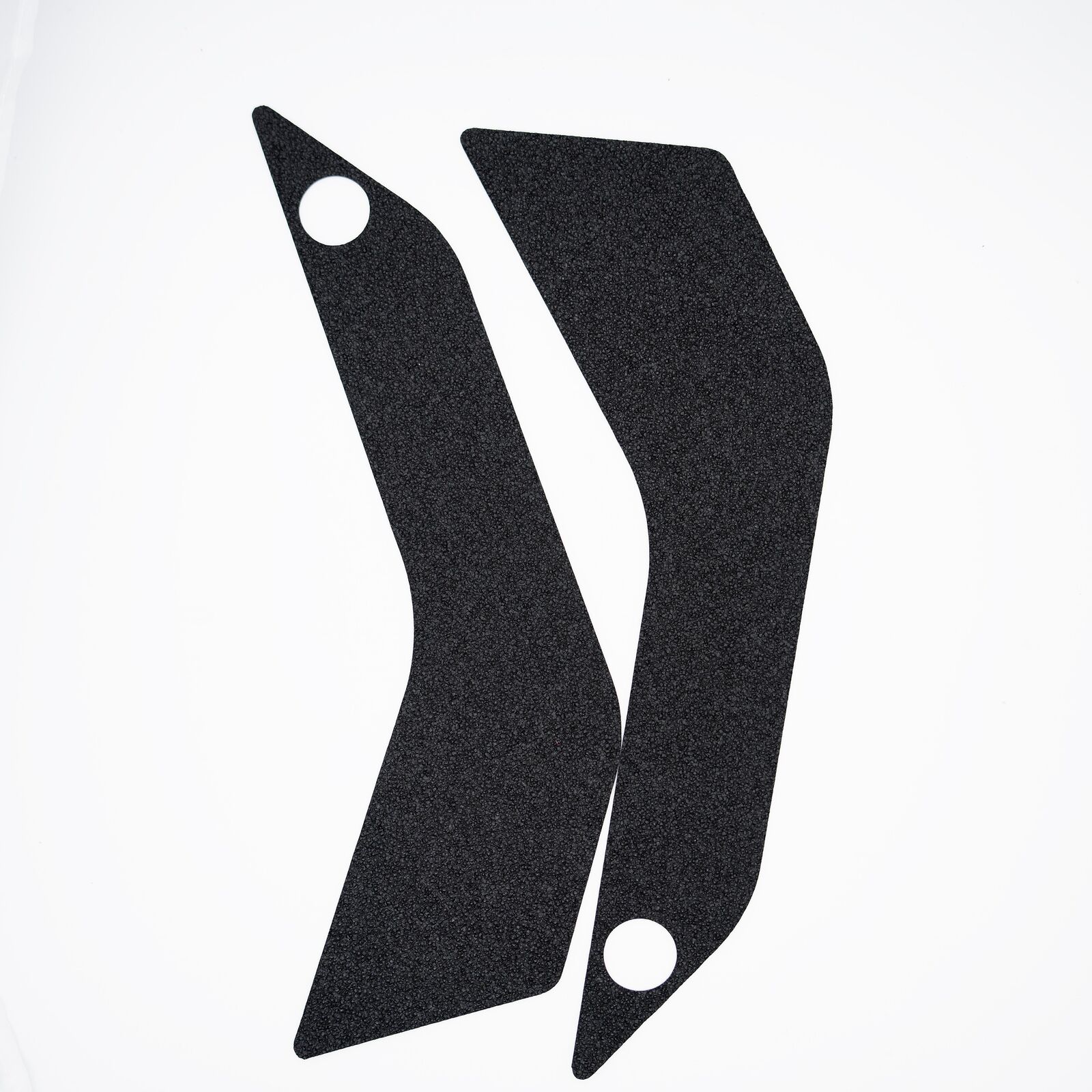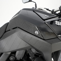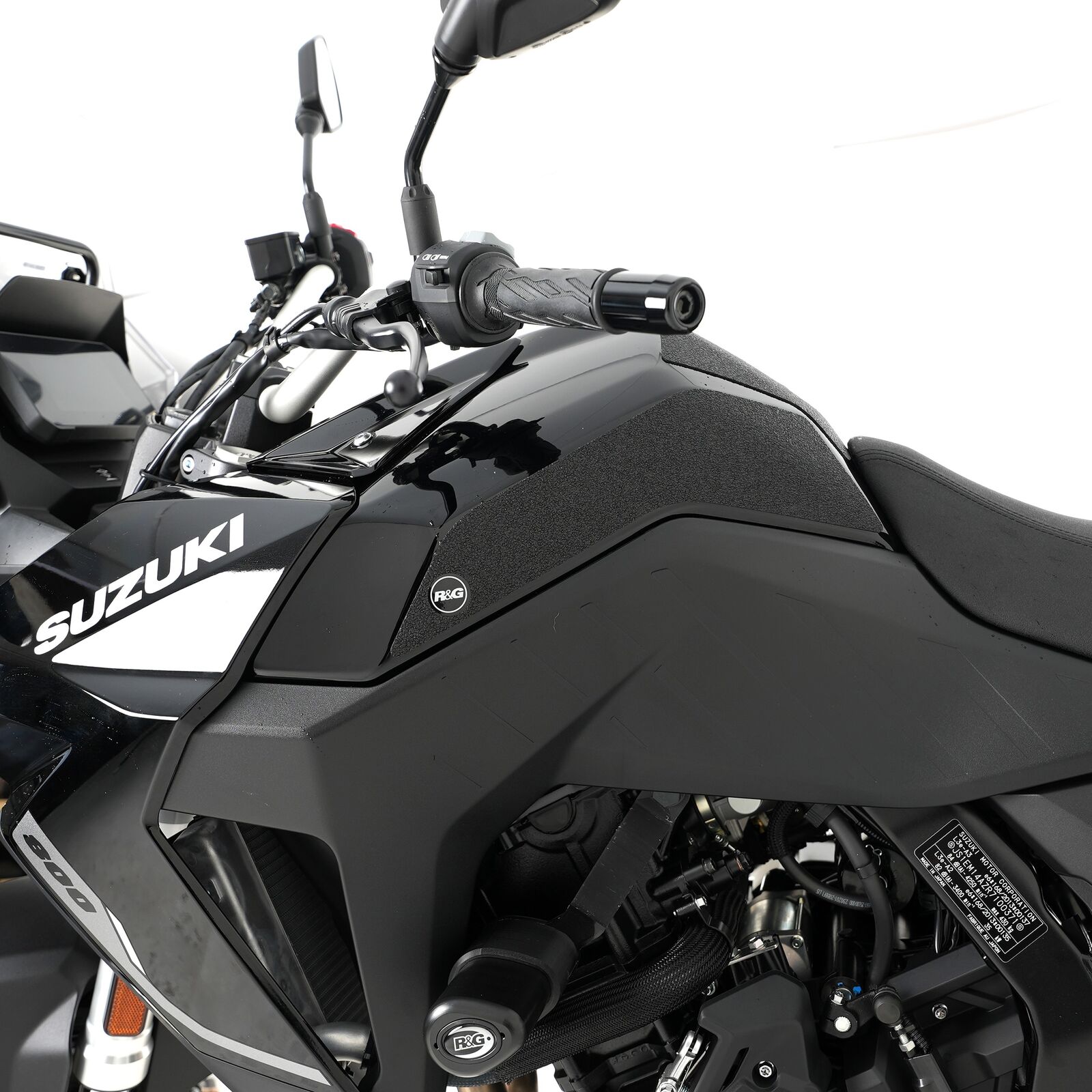 R&G Tank Traction Grip kits are available for many different bike styles and brands, with new applications released regularly. The unique R&G Traction Grip texture was specifically designed to be both soft and durable, providing the rider with the grip and feel he/she needs to assist in better bike control, enabling the rider to maintain a stable body position while cornering and braking, whilst also relieving fatigue and providing the rider with complete confidence allowing him/her to fully focus on the road (or track) ahead instead of slipping and sliding on the tank. Each Tank Traction Grip kit is supplied with precision pre-cut adhesive pieces, designed to fit the intended bike, typically in either 2, 4 or 6 pieces (in total) depending on the shape of the tank and adjoining fairing. The high-strength adhesive backing ensures a highly durable product that will stay exactly where you put it, as well as not affecting or damaging paintwork. Each R&G Tank Traction Grip kit is available in black and ultra-clear finishes to blend into your bike’s paintwork or stand out, depending on your preference. R&G Tank Traction Grips work in both wet and dry conditions and is equally at home on the track as it is on the commute home! Please note: R&G Tank Traction Grips now come with a 25mm diameter stick on emblem. This 2-piece R&G Tank Traction Grip kit has been specially designed for the Suzuki V-Strom 800 '23-  model. Made in the UK.