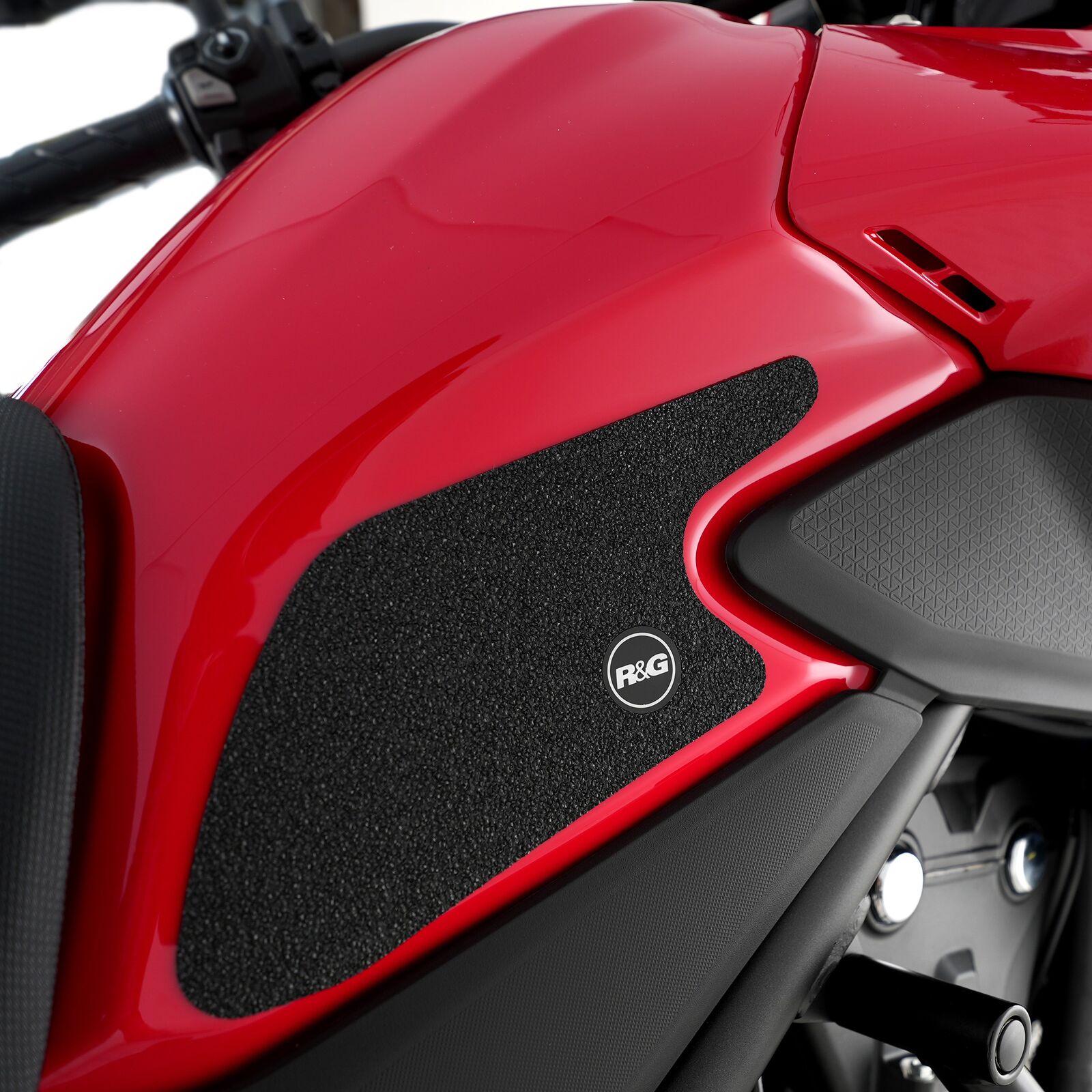 R&G Tank Traction Grip kits are available for many different bike styles and brands, with new applications released regularly. The unique R&G Tank Traction Grip texture was specifically designed to be both soft and durable, providing the rider with the grip and feel he/she needs to assist in better bike control, enabling the rider to maintain a stable body position while cornering and braking, whilst also relieving fatigue and providing the rider with complete confidence allowing him/her to fully focus on the road (or track) ahead instead of slipping and sliding on the tank.