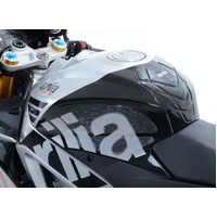 R&G Tank Traction Pad kits are available for many different bike styles and brands, with new applications released regularly. The unique R&G Traction Pad texture was specifically designed to be both soft and durable, providing the rider with the grip and feel he/she needs to assist in better bike control, enabling the rider to maintain a stable body position while cornering and braking, whilst also relieving fatigue and providing the rider with complete confidence allowing him/her to fully focus on the road (or track) ahead instead of slipping and sliding on the tank. Each Tank Traction Pad kit is supplied with precision pre-cut adhesive pieces, designed to fit the intended bike, typically in either 2, 4 or 6 pieces (in total) depending on the shape of the tank and adjoining fairing. The high-strength adhesive backing ensures a highly durable product that will stay exactly where you put it, as well as not affecting or damaging paintwork. Each R&G Tank Traction Pad kit is available in black and ultra-clear finishes to blend into your bike’s paintwork or stand out, depending on your preference. R&G Tank Traction works in both wet and dry conditions and is equally at home on the track as it is on the commute home! Please note: R&G Traction Pads now come with a 25mm diameter stick on emblem. This 4-piece Tank Traction Grip set has been specially designed for the Aprilia RSV4 '09-, Tuono V4 '11-'20 &  RSV4 1100 Factory '19-'20- Made in the UK.