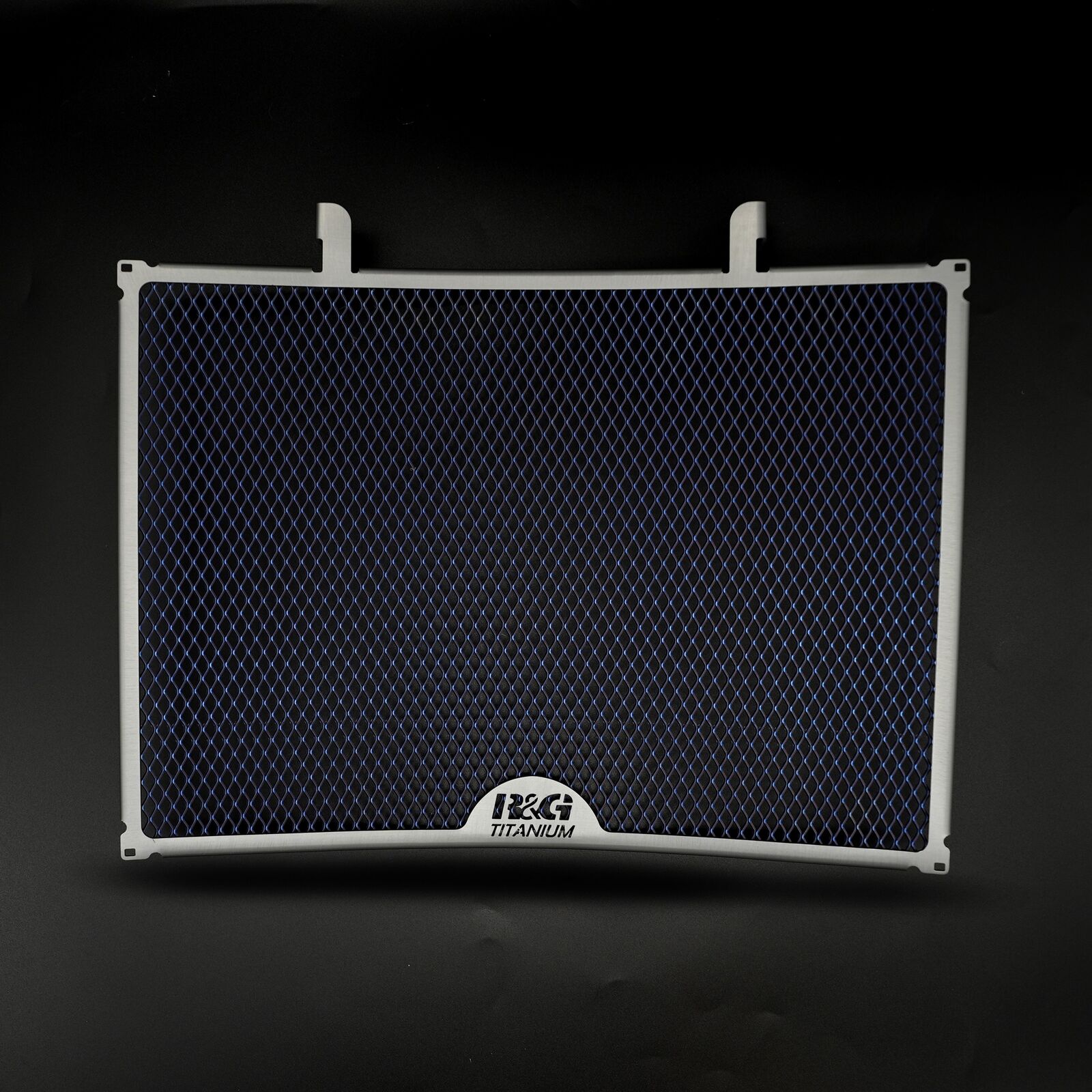 This specific R&G radiator guard is made from an expanded ASTM B265 Grade 1 Titanium sheet and features a neat, seamless aluminium frame, securely holding the guard in place (utilising existing mounting or brackets). Titanium anodised for a fantastic looking, long-lasting product as well as (most importantly) protecting your expensive and vulnerable radiator from damage. The titanium mesh is twice as strong as standard aluminium mesh guards providing excellent protection from road debris such as: stones, bugs, tyre rubber etc. flicked up from either your own front-wheel or other riders either on track or on the road.