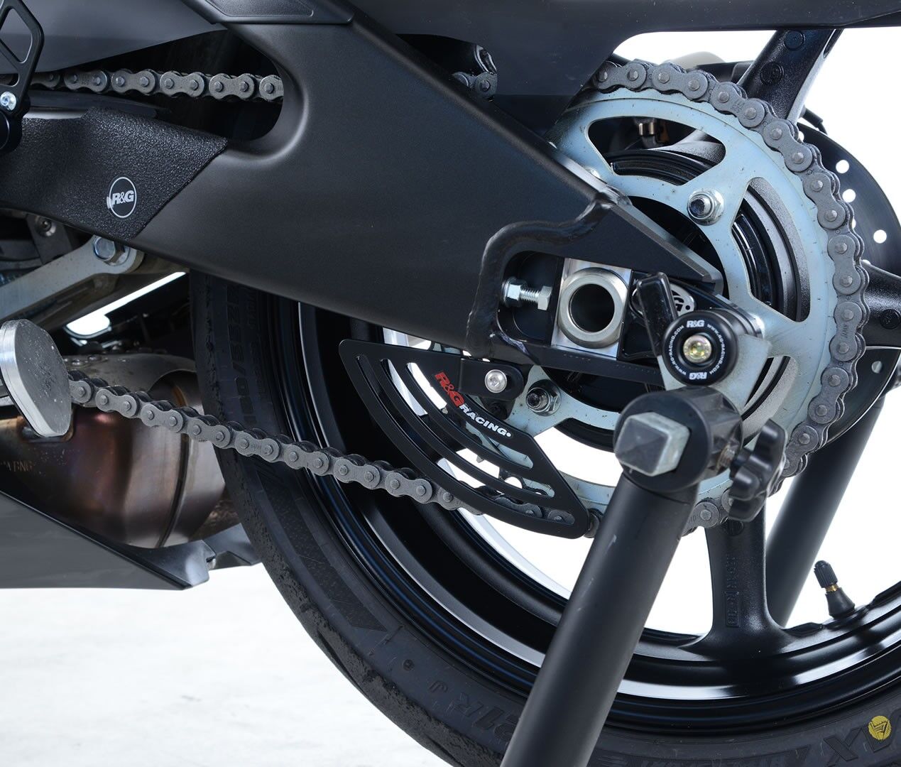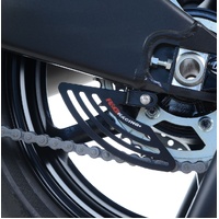 R&G Racing's new, road-racing inspired toe guard has been developed for maximum coverage and great looks. Made from aluminium for a lightweight and strong product it features pre-drilled holes attaching to the existing mounts on the swingarm, ensuring effective coverage of the sprocket. This