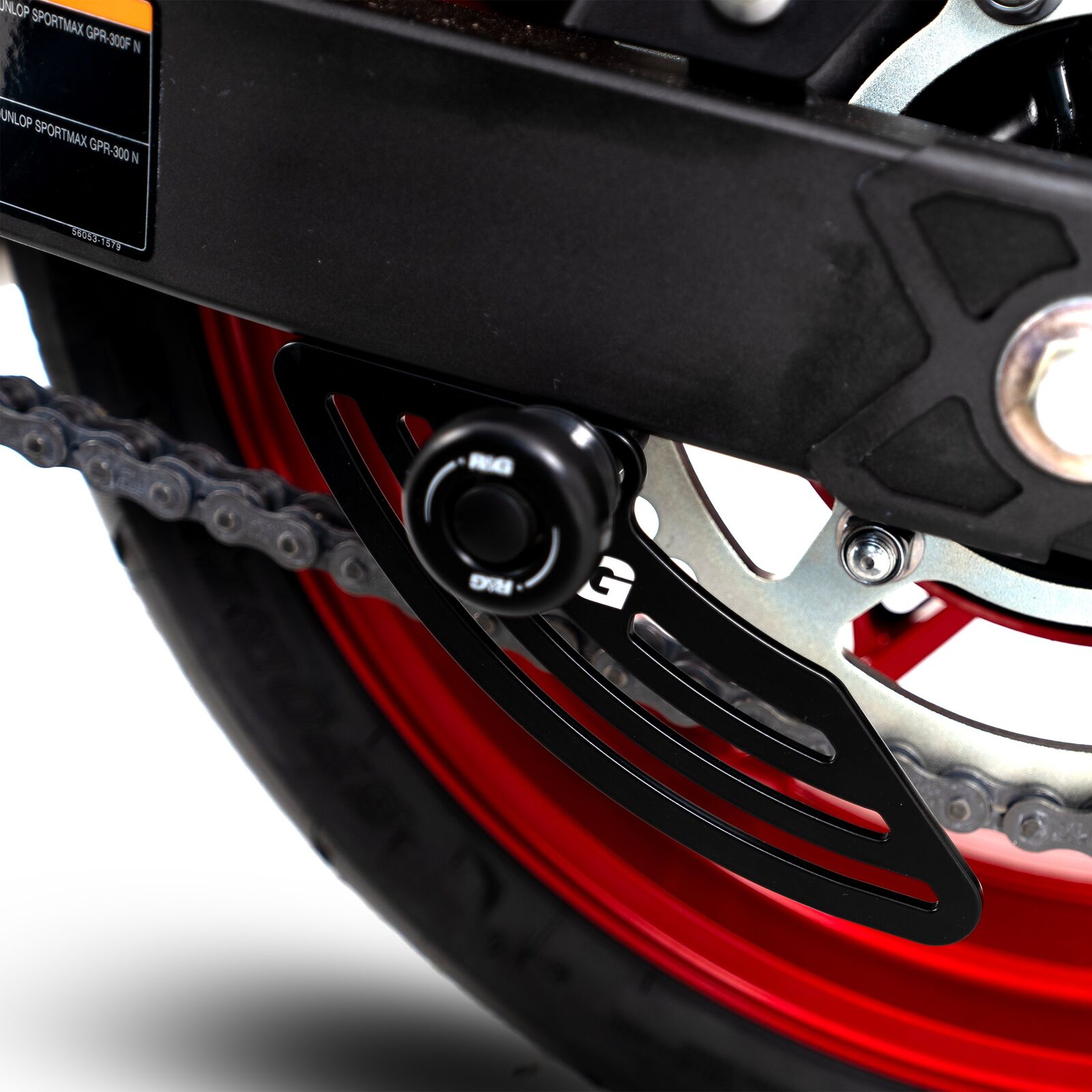 R&G Racing's new, road-racing inspired toe guard. Made from aluminium for a lightweight and strong product it features pre-drilled holes attaching to the existing mounts on the swingarm, ensuring effective coverage of the sprocket. This racing Toe Guard is compatible with the Kawasaki Ninja 250/400 '18-, Z400/ Z250 '19-, ZX-25R '20- & ZX-4R(R) (SE) ’23- '24, Z500 (Ninja) '24- models . No modifications to the bike are required to fit this toe guard.