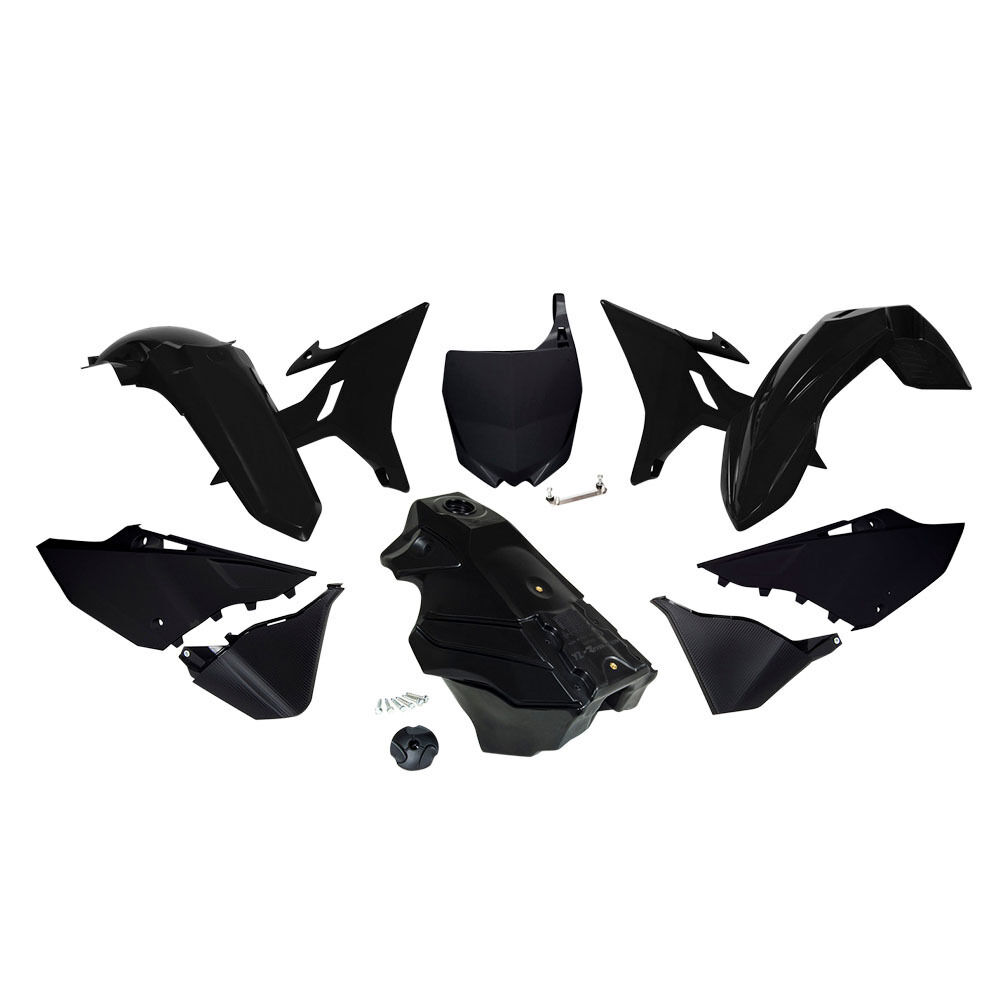 • 7 piece Revolution Kit includes the redesigned Black fuel/gas tank with cap & radiator shrouds, front fender, rear fender, side panels, & front plate with adapter for 02-05 models.