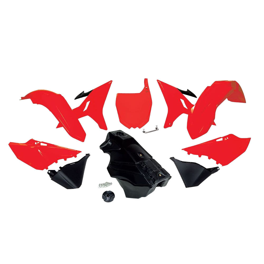 • 7 piece Revolution Kit includes the redesigned Black fuel/gas tank with cap & radiator shrouds, front fender, rear fender, side panels, & front plate with adapter for 02-05 models.