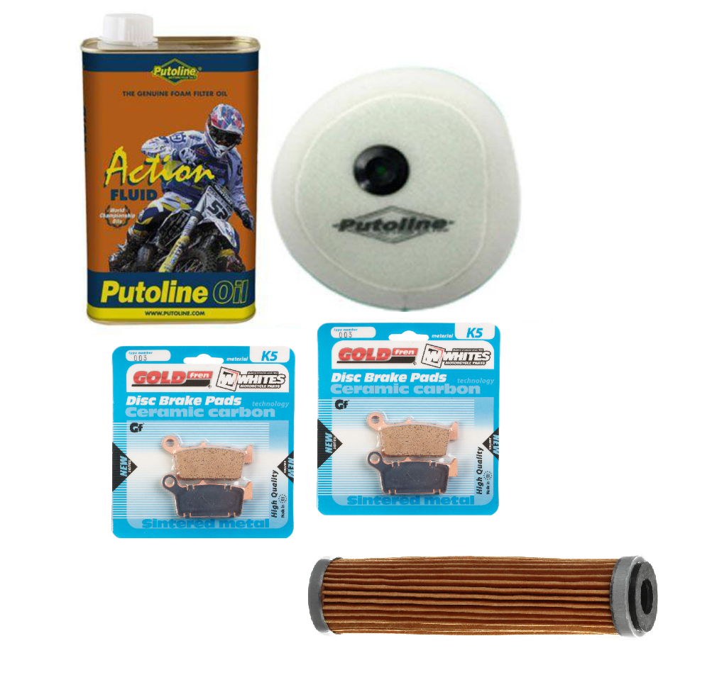 The most convenient one-stop-shop for maintaining your motorcycle. Kits include front brake pads/shoes rear brake pads/shoes an air filter with 1L of filter oil and an oil filter where applicable.