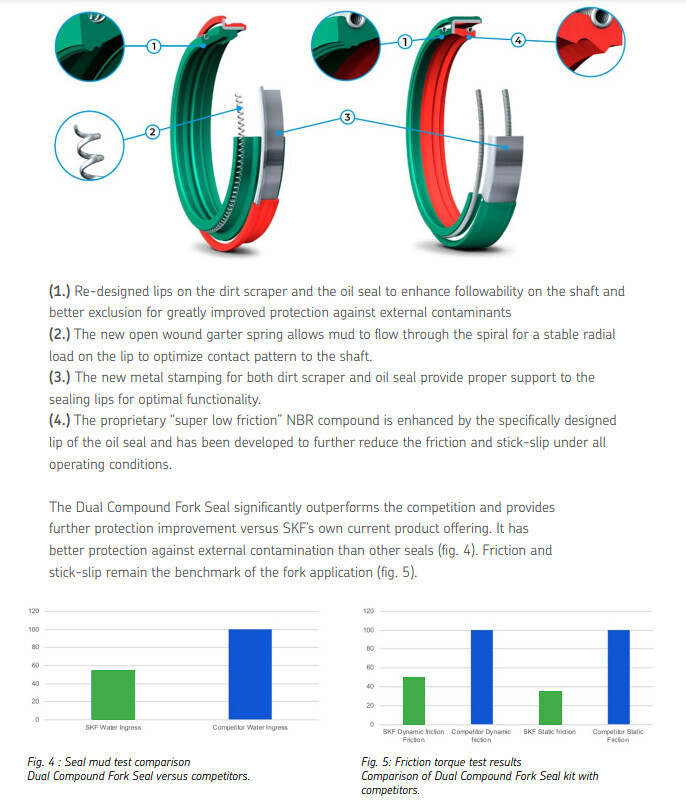 Innovative co-molding production technology which is patent pending by SKF. The rubber compounds are new and different from our previous aftermarket green seals. New metal insert and totally re-designed scraping and oil sealing lips. Open wound DS spring: this is not just a stretched std. spring but a dedicated fork seal spring with open winding.