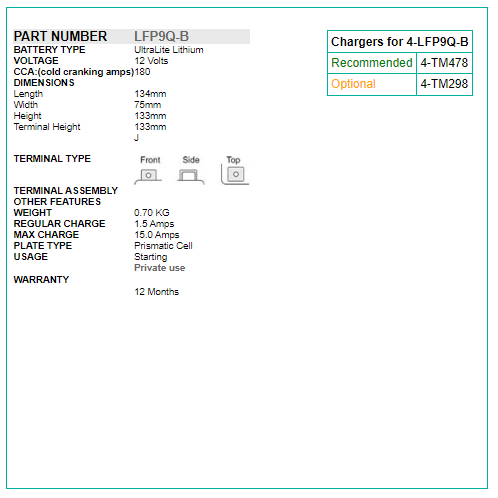 Must be charged with a LiFePO4 specific charger. Use of any other charger invalidates warranty.