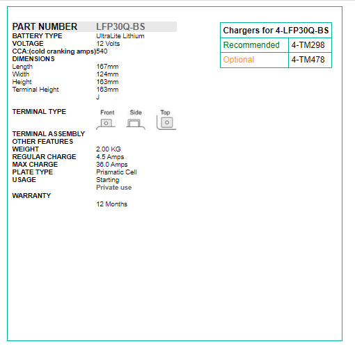 Must be charged with a LiFePO4 specific charger. Use of any other charger invalidates warranty.