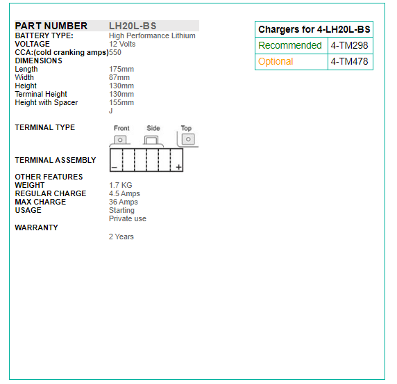 Unlike many other lithium batteries, SSB PowerSport Lithium Batteries are made using prismatic cells making them not only safe to use, but also boasts higher CCA (cold cranking amps), better cyclic properties and have a longer life. Other brands generally use cylindrical cells and while they may be a little cheaper due to lower manufacturing costs, they are inferior and are not designed for starting vehicles.