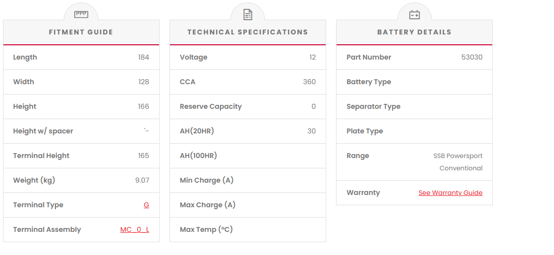 These batteries feature high-impact polypropylene plastic casing for added strength and polyethylene envelope separators for superior performance. The SSB Powersport Conventional Range is manufactured to high-quality standards and exceeds the minimum original equipment (OEM) requirement for most motorcycles sold in Australia. This range consists of both 6 and 12 Volt varieties. They are also available in all capacities and sizes ranging from 2 to 25 amp/hour, complete with acid packs and filling instructions.
