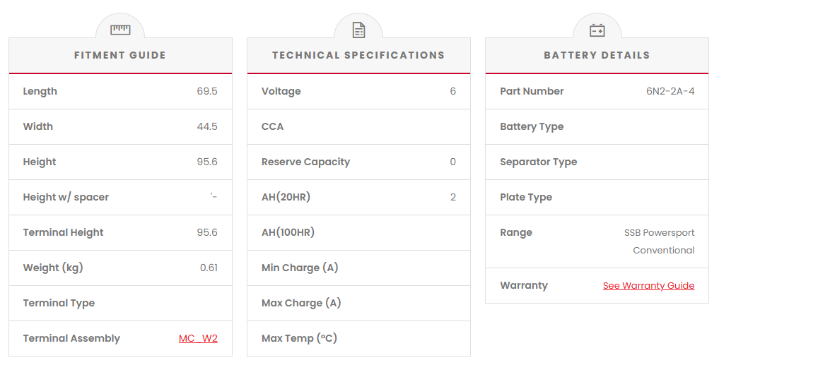 These batteries feature high-impact polypropylene plastic casing for added strength and polyethylene envelope separators for superior performance. The SSB Powersport Conventional Range is manufactured to high-quality standards and exceeds the minimum original equipment (OEM) requirement for most motorcycles sold in Australia. This range consists of both 6 and 12 Volt varieties. They are also available in all capacities and sizes ranging from 2 to 25 amp/hour, complete with acid packs and filling instructions.