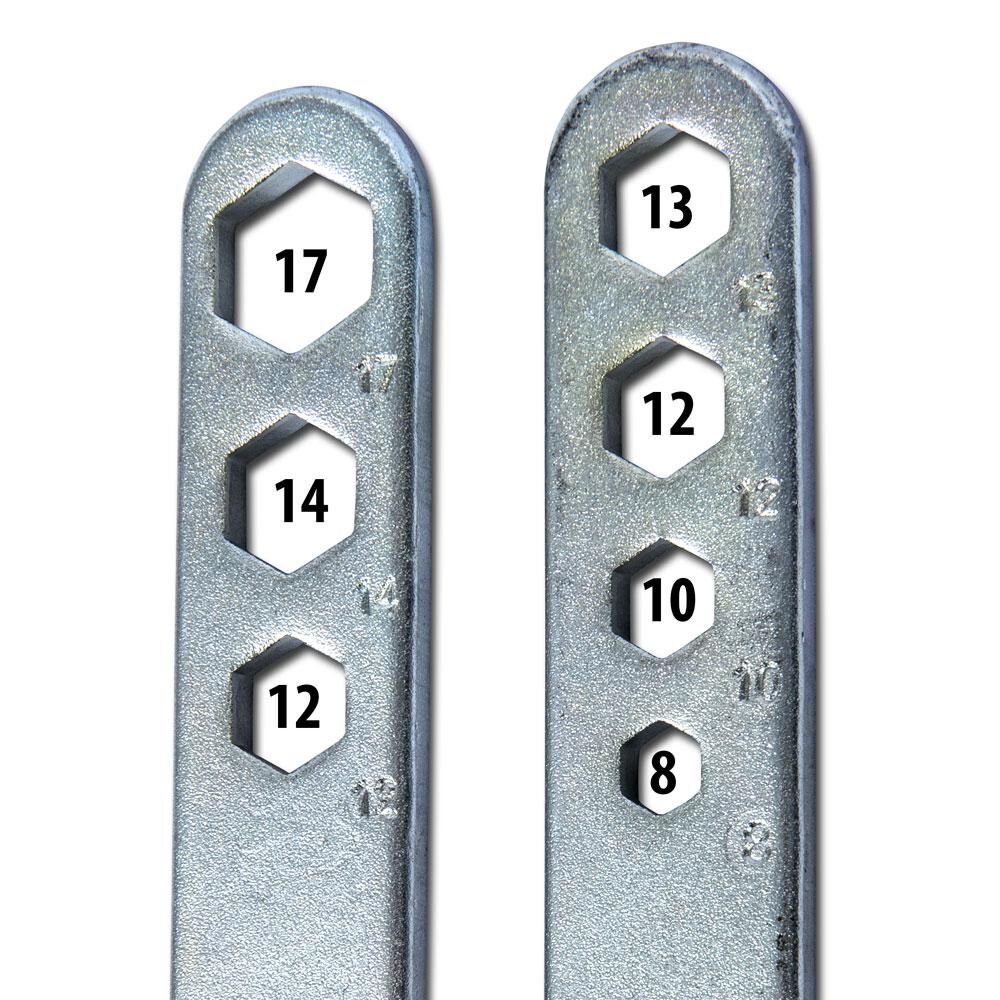 The handy hex cut-outs in 8, 10, 12, 13,14 & 17mm allow the levers to be used as a spanner.