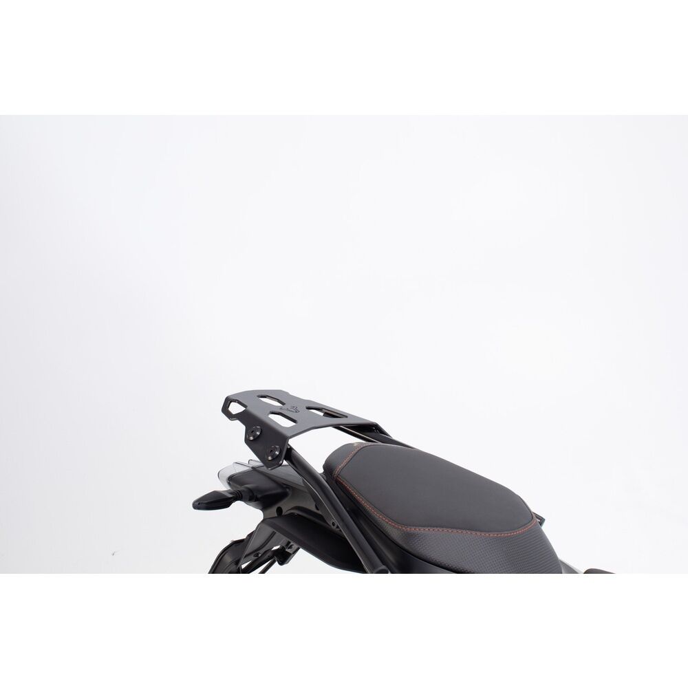 Secure transportation of wide bags and luggage rolls: the stable extension almost doubles the size of the STREET-RACK adapter plate contact surface. The many tie-down points and the raised elements in the front and back of the expansion are perfect for securely mounting bulky luggage. A black powder coating protects the aluminum construction from corrosion and gives it an appealing look.No tools are required for attaching the adapter plate to the STREET-RACK. The adapter plate is simply slid onto the rack and securely locked using the rotating cam latch. After your ride, the adapter plate can be removed in seconds and just the rack stays on the motorcycle.