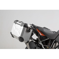 The Adventure set luggage for the KTM 1050/ 1090/ 1190 Adv, 1290 SAdv. contains the matching PRO side carrier as well as corresponding ADVENTURE-RACK. The side carriers and rack are attached to the bike-specific attachment points and offer a secure hold for the silver TRAX ADV aluminum cases.