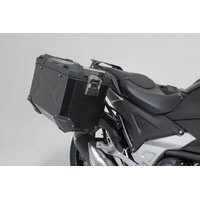 The Adventure set luggage includes the PRO side carriers and STREET-RACK designed to fit the Honda NC 750 X. The side carrier and rack are fastened to the bike-specific attachment points and offer sturdy support for the black TRAX ADV aluminium cases.
