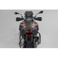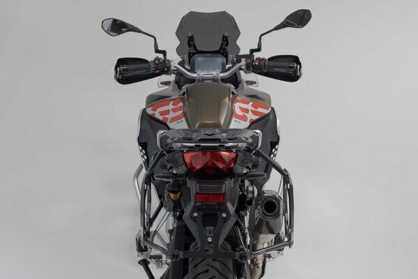 The Adventure set luggage for the BMW F 850 GS Adventure includes the PRO side carriers and matching ADVENTURE-RACK. The side carriers and rack are attached to the bike-specific attachment points and offer a secure hold for the silver TRAX ADV aluminum cases.