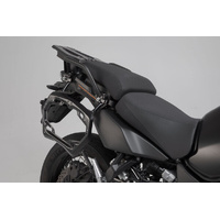 Durable TRAX ADV aluminum cases feel at home on any stretch of road: embossed patterns add stability to the 1.5 millimeter-thick, welded aluminum wall material. A completely removable lid with carrying handles made of anodized aluminum and quick release fasteners makes loading and unloading of motorcycle luggage easier; the beveled side edge provides high ground clearance when cornering. With this complete solution, you have all the components you need to travel with TRAX: two waterproof TRAX ADV side cases, two detachable SW-MOTECH side carriers, adapter kit, lock set, lid limiter and anti-theft protection at an attractive price.
