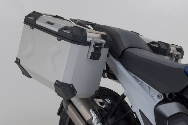 Durable TRAX ADV aluminum cases feel at home on any stretch of road: embossed patterns add stability to the 1.5 millimeter-thick, welded aluminum wall material. A completely removable lid with carrying handles made of anodized aluminum and quick release fasteners makes loading and unloading of motorcycle luggage easier; the beveled side edge provides high ground clearance when cornering. With this complete solution, you have all the components you need to travel with TRAX: two waterproof TRAX ADV side cases, two detachable SW-MOTECH side carriers, adapter kit, lock set, lid limiter and anti-theft protection at an attractive price.