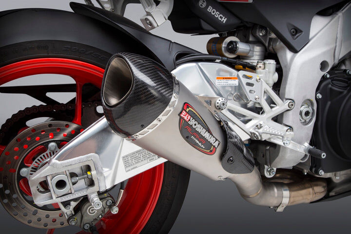 Now Yoshimura is making available our Race Series Alpha-T in Titanium Works Finish the fits both Tuono and RSV4 models. Immediately when our Alpha-T is installed, the shear roar of the V4 engine is mind bending. The exhaust note that this bike emits is one of a kind replicating like nothing else. Add to that a dramatic weight loss of 10 pounds over the stock unit, added power and torque... and its on! This Alpha-T slip-on comes complete with carbon fiber heat shield.