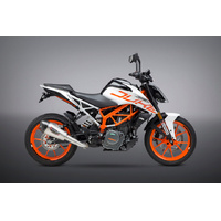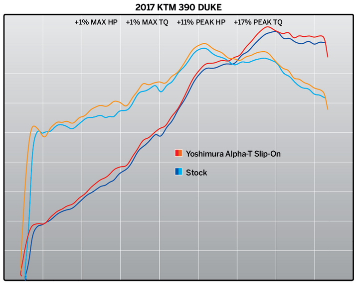 Both of these fun machines are a blast to ride, now Yoshimura helps the 390 pack a punch and look even better. Our new Works Finish Alpha-T slip on adds the distinctive Yoshimura sound and provides the 390 single cylinder engine 11% peak H.P. and 17% peak torque. Can you say fun?