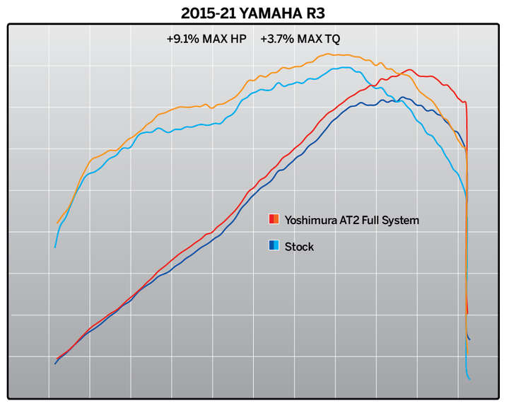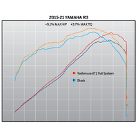 Our race-bred AT2 system makes the R3 come alive providing a 9.1% max H.P. gain and a 3.7% max torque gain! Adding to the increased performance is a huge weight savings of 9.6 pounds! That's over half the weight of the stock OEM full system!