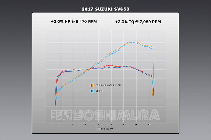 Yoshimura R&D engineers developed the already iconic AT2 slip-on for the current gen SV. Not only does it deliver styling and weight reduction, it also delivers some serious performance. Max horsepower is up 3% and max torque was logged at 3%. That's the kind of performance that makes the SV650 even more fun to ride. The race inspired AT2 Street Series slip-on is exactly what your SV650 has been craving.