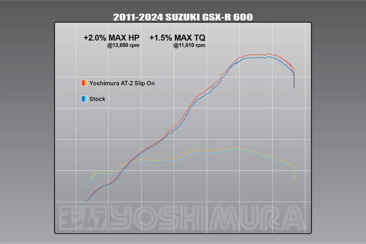 The AT2 has style, performance and sound that is second to none. The GSX-R 600/750 is deserving of such a product like the AT2. A faceted rear cap enclosed by a beautiful matte carbon fiber AT2 end cap and custom heal guard has quickly become a main stay for the Yoshimura enthusiast.