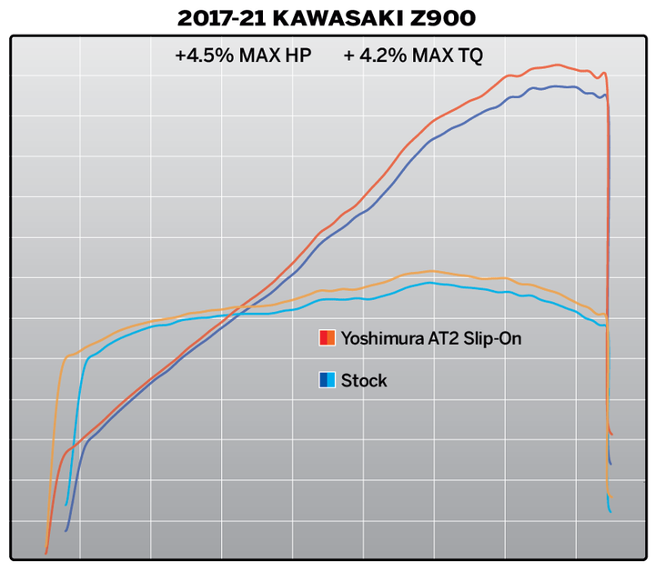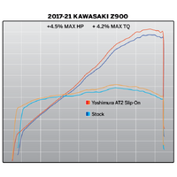 AT2 slip-on gets rid of excess weight from the stock muffler 5.0 lbs. vs. 8.9 lbs. for the stock muffler. The new AT2 makes the inline four cylinder engine perk up nicely and provides an increase in horsepower max 4.5% and a max torque of 4.2%. Features include a custom stainless heat shield, exclusive Works Finish, an aggressively styled matte finish carbon fiber end cap and heal guard complimented by a facet-formed formed tip. Add the tone of our AT2 and it puts the Z900 in another category. Street Series means that our new AT2 is 50-state emissions legal and mounts up in minutes!