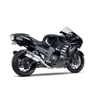 It features a trapezoidal design, which allows a large volume of packing material and in turn delivers top performance. The R-77 muffler's front cap is MIG-welded, while the end cap is riveted using high-end 304-L polished stainless steel rivets and bands.