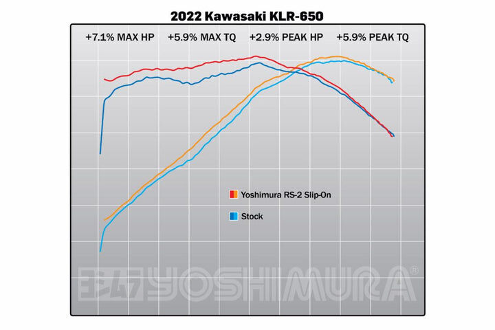 Speaking of performance the new KLR enjoys some big performance with our RS-2. While doing our off-road development, we were able to make massive gains in the middle of the power where the big cylinder engine spends most of its time making the KLR more fun and predictable. Our R&D team was able to gain power across the entire spectrum, boosting the peak horsepower by 7.1% while the peak torque was upped by 5.9%! RS-2 for the KLR comes with a USFS approved spark arrestor installed. Get ready to have fun!