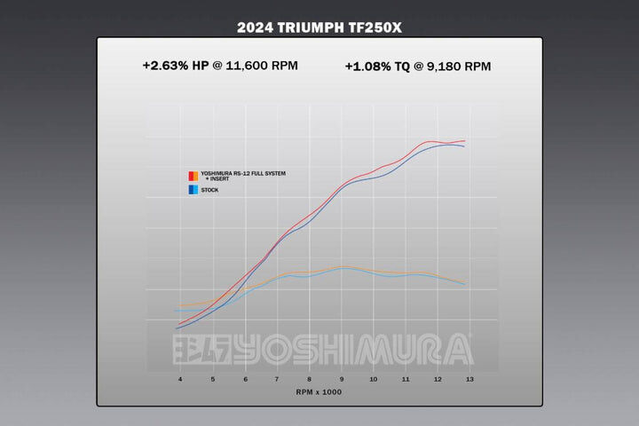 Our now-iconic RS-12 Signature Series full system not only looks stunning on the TF250X but also delivers significant power gains across the entire spectrum. Riders can expect up to a 2.63% increase in horsepower at 11,600 rpm and torque improvements of up to 1.08% at 9,180 rpm.